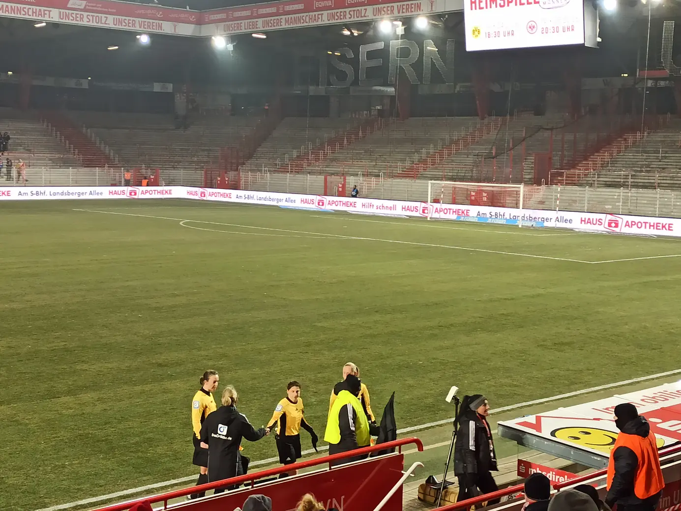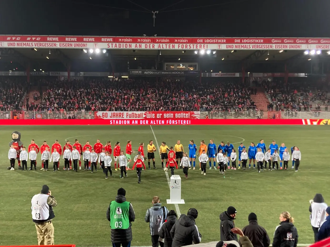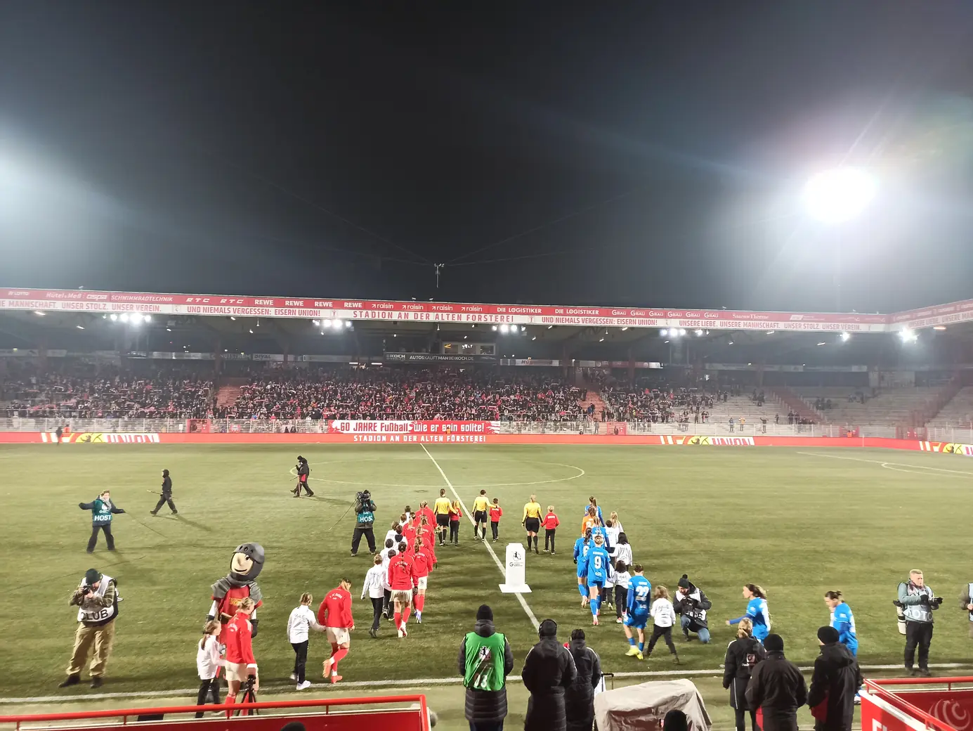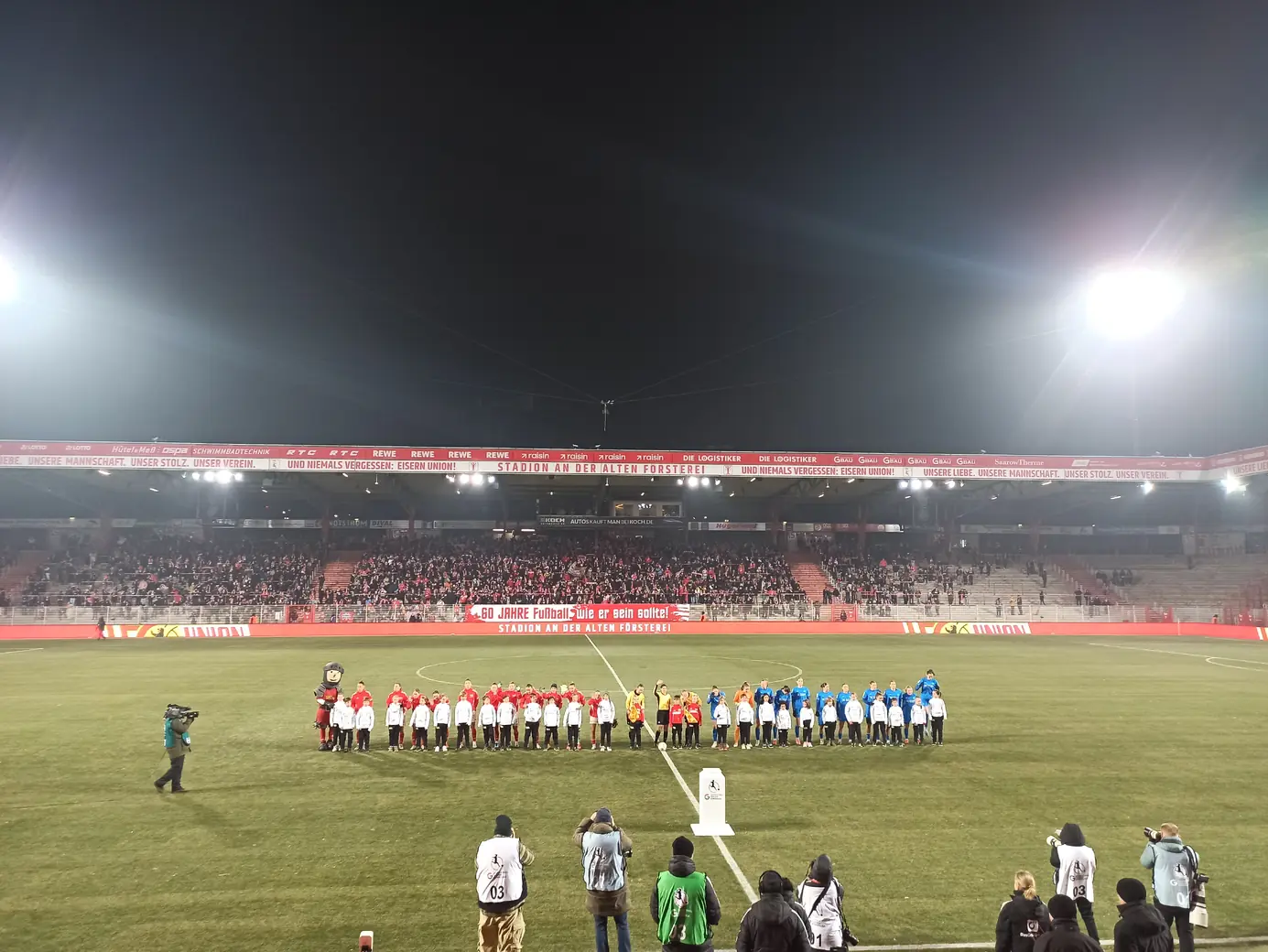 Die Frauen von Union Berlin haben in den letzten Jahren einen steilen Aufstieg hingelegt – wobei ihre Geschichte schon lange zurückreicht. Die Frauenmannschaft beim 1. FC Union Berlin besteht seit 1969 und war eines der ersten Frauenteams in der DDR. Mit der Eingliederung des Frauenfußballs in den Volkssportbereich durch den DDR-Fußballverband im Sommer 1971 änderten sich die Rahmenbedingungen für das Team. Da Union Berlin als Leistungsklub keine Freizeitmannschaft führen durfte, mussten sich die Spielerinnen einen neuen Verein suchen. In der Folge schlossen sie sich als Volkssportgemeinschaft dem Kabelwerk Oberspree an. Nach der Wende löste sich die BSG Kabelwerk Oberspree Berlin, und Union Berlin bekam wieder ein eigenes Frauenteam. Die folgenden 30 Jahre spielte das Team meist in der Drittklassigkeit, mit vereinzelten Ausflügen in die 2. Bundesliga. Zur Saison 2023/24 wurde die 1. Frauenmannschaft in eine reine Profiabteilung umgewandelt. Sie stiegen in der Saison verlustpunktfrei von der Regionalliga in die 2. Bundesliga auf und zogen wie die Männer ins Stadion an der alten Försterei. Es gelang mit Platz 1 in der 2. Bundesliga der direkte Durchmarsch und so spielen sie 2025/26 ihre Bundesliga-Premierensaison. Die Bundesliga wurde zu dieser Saison auf 14 Teams aufgestockt. Das ist mit 26 Spieltagen eigentlich immer noch ein überschaubarer Terminkalender. Da die Liga aber erst Anfang September startet und Mitte Mai schon wieder beendet ist, kommt sie trotzdem nicht über einige Winterspieltage hinweg. Damit sind wie jedes Jahr die Spielabsagen vorprogrammiert. Wirklich klar ist mir nicht, warum sie nicht Mitte August anfangen und noch einen weiteren Spieltag in den Mai schieben. An diesem Spieltag hat es direkt Jena und Frankfurt getroffen, bei denen der Platz aufgrund der winterlichen Temperaturen nicht bespielbar war. Das Problem haben die Frauen von Union zum Glück nicht. Die Alte Försterei hat eine Rasenheizung, die aufgrund des Männer-Spielbetriebs ja ohnehin läuft. Und die Rasenheizung war für das heutige Spiel definitiv notwendig. Es herrschte seit Tagen Dauerfrost in Berlin und heute Abend waren es kühle −5 °C. An mein kältestes Spiel in Rostock aus dem Jahr 2009 mit −11 °C kommt es nicht ran, aber Platz zwei der Frostrangliste könnte es sein. Union bietet zum Glück zu der Jahreszeit Glühwein an, das versprüht gleich ein wenig Weihnachtsmarkt-Feeling. Mein Onkel hat sich nicht lumpen lassen und Karten in allerbester Lage geholt. Sitzplätze, zentral an der Mittellinie, Reihe 6. So direkt am Spielertunnel zu sitzen und die Spielerinnen von Nahem zu sehen ist schon was Besonderes.Zu Beginn der Partie wurde Dr. Riem Hussein, die Schiedsrichterin der heutigen Partie, für ihren 150. Bundesliga-Einsatz geehrt. Diese Zahl hatte vor ihr noch keine Schiedsrichterin erreicht. Ich habe sie heute zum zweiten Mal live gesehen. Das erste Mal war es beim Pokalfinale 2010.