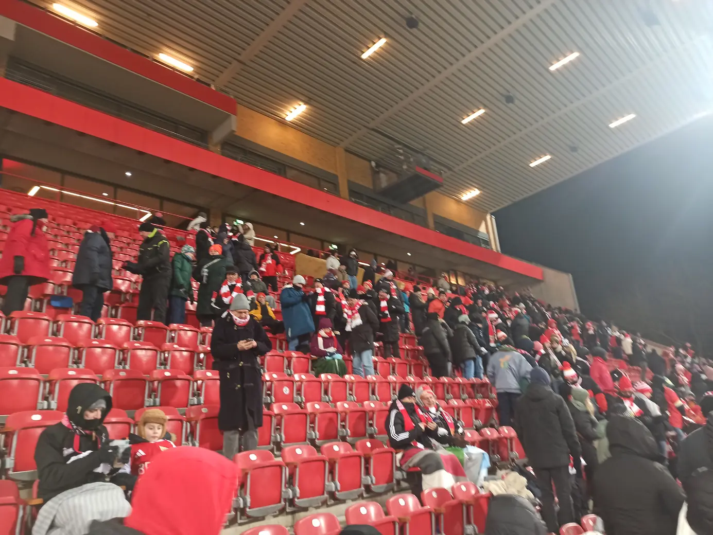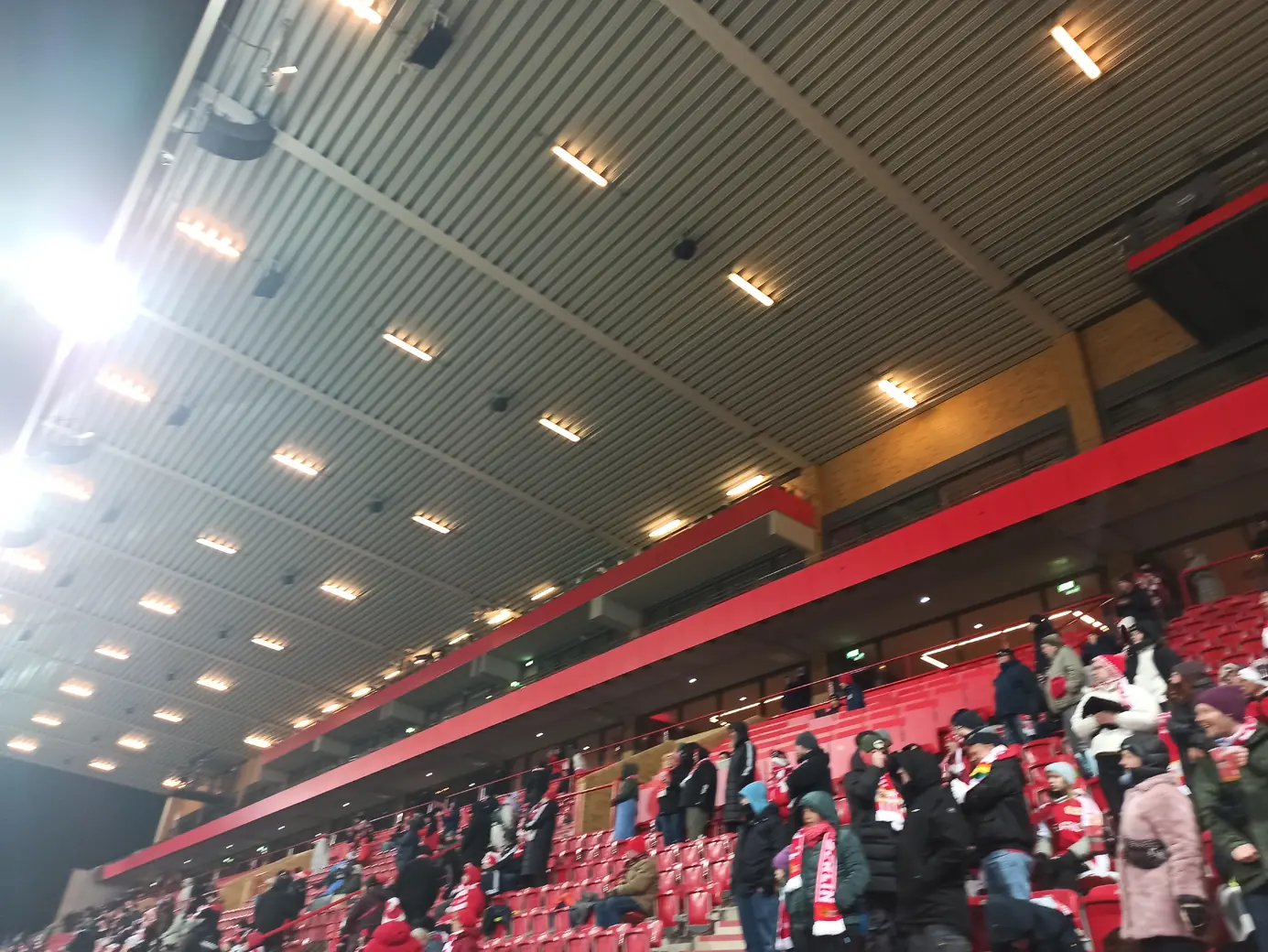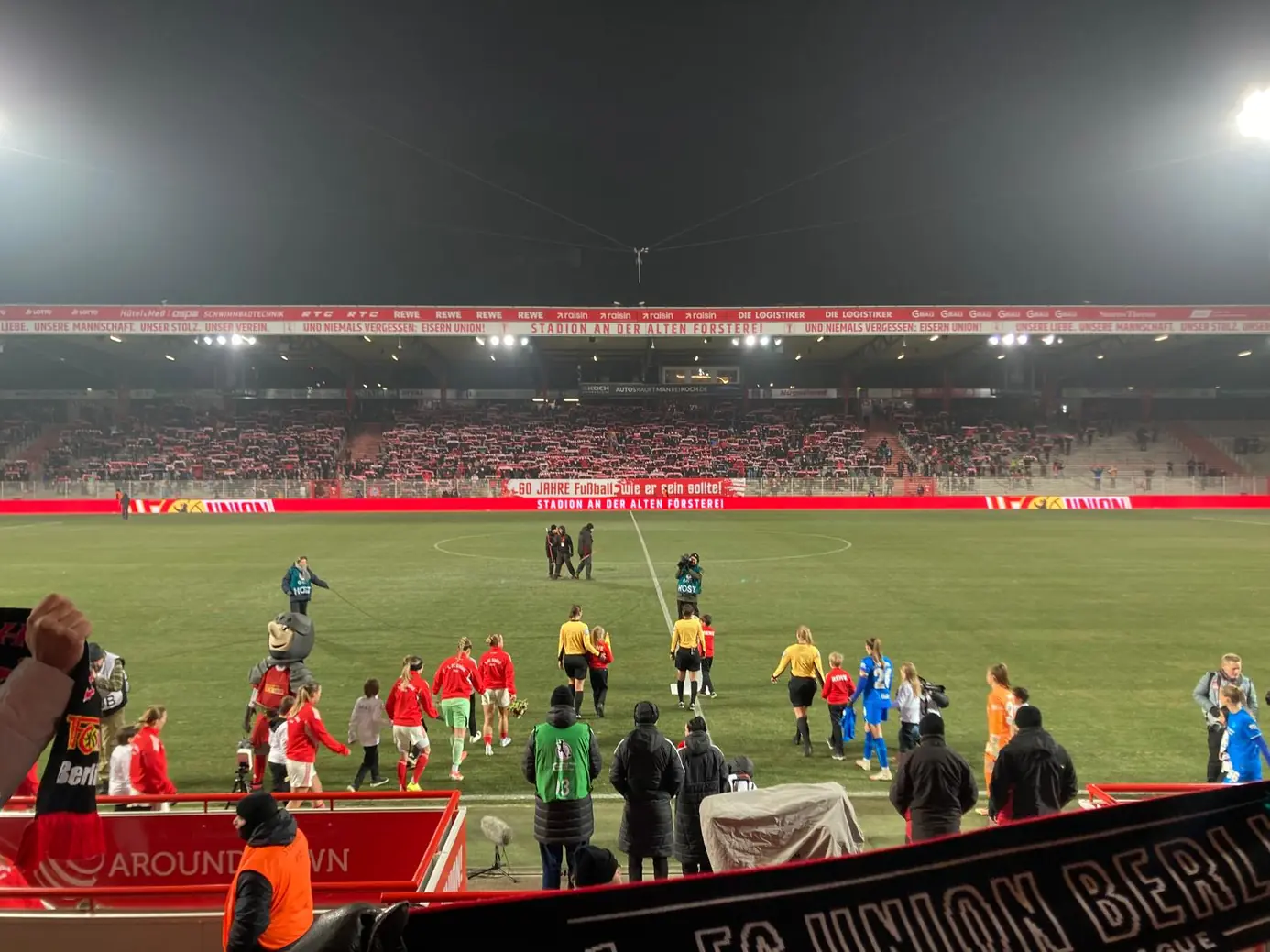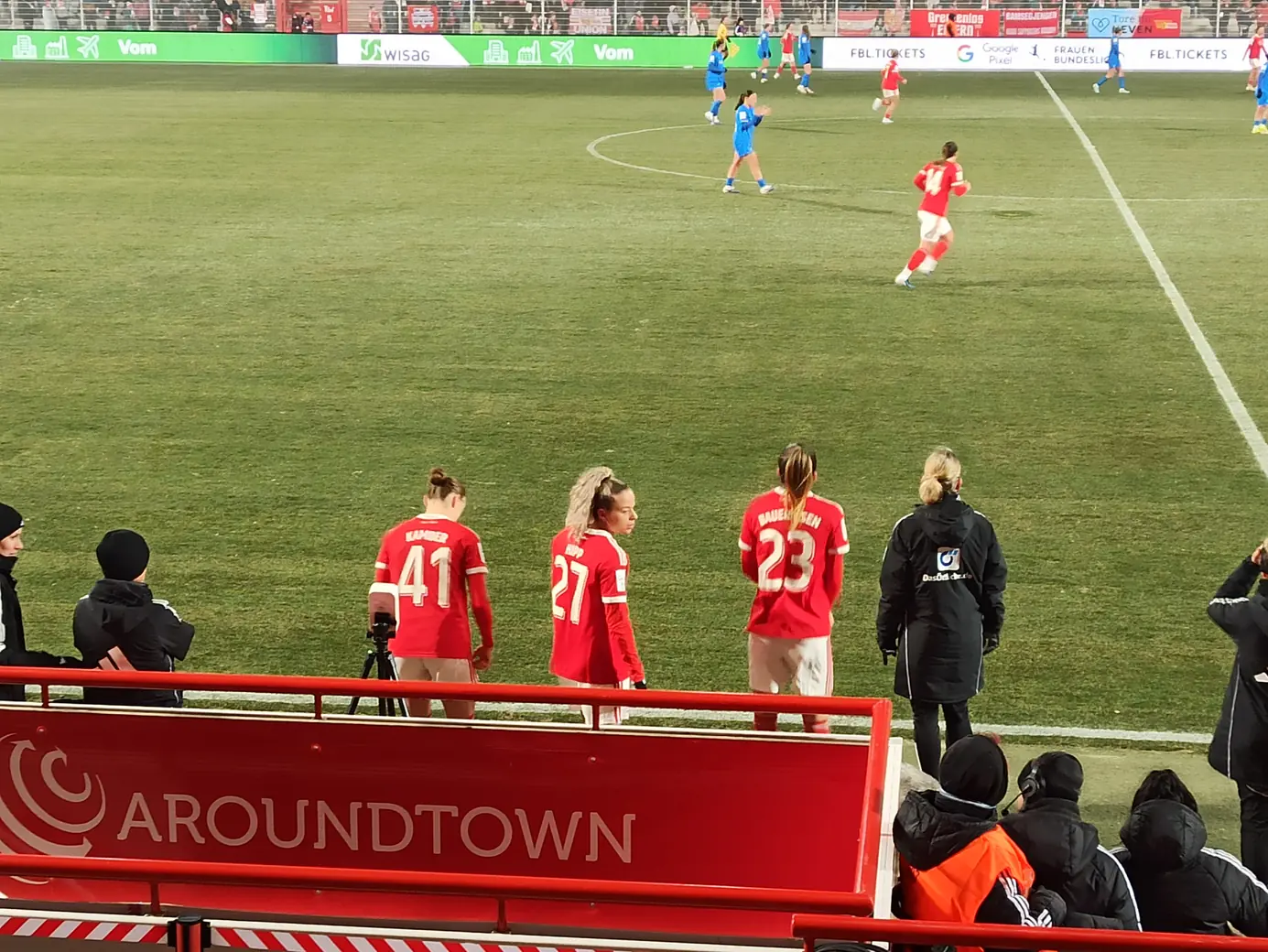 Die Frauen von Union Berlin haben in den letzten Jahren einen steilen Aufstieg hingelegt – wobei ihre Geschichte schon lange zurückreicht. Die Frauenmannschaft beim 1. FC Union Berlin besteht seit 1969 und war eines der ersten Frauenteams in der DDR. Mit der Eingliederung des Frauenfußballs in den Volkssportbereich durch den DDR-Fußballverband im Sommer 1971 änderten sich die Rahmenbedingungen für das Team. Da Union Berlin als Leistungsklub keine Freizeitmannschaft führen durfte, mussten sich die Spielerinnen einen neuen Verein suchen. In der Folge schlossen sie sich als Volkssportgemeinschaft dem Kabelwerk Oberspree an. Nach der Wende löste sich die BSG Kabelwerk Oberspree Berlin, und Union Berlin bekam wieder ein eigenes Frauenteam. Die folgenden 30 Jahre spielte das Team meist in der Drittklassigkeit, mit vereinzelten Ausflügen in die 2. Bundesliga. Zur Saison 2023/24 wurde die 1. Frauenmannschaft in eine reine Profiabteilung umgewandelt. Sie stiegen in der Saison verlustpunktfrei von der Regionalliga in die 2. Bundesliga auf und zogen wie die Männer ins Stadion an der alten Försterei. Es gelang mit Platz 1 in der 2. Bundesliga der direkte Durchmarsch und so spielen sie 2025/26 ihre Bundesliga-Premierensaison. Die Bundesliga wurde zu dieser Saison auf 14 Teams aufgestockt. Das ist mit 26 Spieltagen eigentlich immer noch ein überschaubarer Terminkalender. Da die Liga aber erst Anfang September startet und Mitte Mai schon wieder beendet ist, kommt sie trotzdem nicht über einige Winterspieltage hinweg. Damit sind wie jedes Jahr die Spielabsagen vorprogrammiert. Wirklich klar ist mir nicht, warum sie nicht Mitte August anfangen und noch einen weiteren Spieltag in den Mai schieben. An diesem Spieltag hat es direkt Jena und Frankfurt getroffen, bei denen der Platz aufgrund der winterlichen Temperaturen nicht bespielbar war. Das Problem haben die Frauen von Union zum Glück nicht. Die Alte Försterei hat eine Rasenheizung, die aufgrund des Männer-Spielbetriebs ja ohnehin läuft. Und die Rasenheizung war für das heutige Spiel definitiv notwendig. Es herrschte seit Tagen Dauerfrost in Berlin und heute Abend waren es kühle −5 °C. An mein kältestes Spiel in Rostock aus dem Jahr 2009 mit −11 °C kommt es nicht ran, aber Platz zwei der Frostrangliste könnte es sein. Union bietet zum Glück zu der Jahreszeit Glühwein an, das versprüht gleich ein wenig Weihnachtsmarkt-Feeling. Mein Onkel hat sich nicht lumpen lassen und Karten in allerbester Lage geholt. Sitzplätze, zentral an der Mittellinie, Reihe 6. So direkt am Spielertunnel zu sitzen und die Spielerinnen von Nahem zu sehen ist schon was Besonderes.Zu Beginn der Partie wurde Dr. Riem Hussein, die Schiedsrichterin der heutigen Partie, für ihren 150. Bundesliga-Einsatz geehrt. Diese Zahl hatte vor ihr noch keine Schiedsrichterin erreicht. Ich habe sie heute zum zweiten Mal live gesehen. Das erste Mal war es beim Pokalfinale 2010.