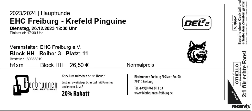 Sportlich läuft es für Freiburg gerade mäßig. Vor dem Spieltag stehen sie auf Platz 11 (von 14 Mannschaften). Bliebe das so nach den 52 Saisonspielen, so hieße das Play-Down. In der DEL 2 spielen die letzten vier Mannschaften im K.-o.-Modus einen Absteiger in die Oberliga aus. Mannschaften ab Platz 10 spielen um den Meistertitel, mit Pre-Playoffs und Playoffs – wie man es so kennt aus der DEL. Platz 10 ist somit sicherlich für jede Mannschaft das angestrebte Mindestziel. Heute ist der 30. Spieltag und die untere Hälfte ist noch dicht beisammen. Zwischen Platz 5 und dem Tabellenletzten sind nur zehn Punkte Unterschied. Mit noch 22 ausstehenden Spieltagen ist für alle noch alles drin. Krefeld kam als Tabellenachter nach Freiburg, mit sechs Punkten mehr auf dem Konto als Freiburg. Das sah erstmal nach einer offenen Partie ohne Favoriten aus. So richtig offen gestaltete sich die Partie eher nicht. Freiburg war im Prinzip das ganze Spiel überlegen. Vor allem im ersten Drittel kam vom Krefeld sehr wenig. Freiburg hat die Chancen allerdings nicht verwertet und so ging Krefeld in Unterzahl sechs Sekunden vor Drittelende unverdient in Führung. Doch im zweiten Drittel hielt die Führung nur eine gute Minute. Freiburg nutzte eine 25-sekündige 5:3 Überzahl zum Ausgleich. Mit der nächsten Überzahl gingen sie mit 2:1 in Führung. Drei Minuten vor Spielende wurde es nochmal wild. Eigentlich sah die mittlerweile 3:1 Führung für Freiburg sicher aus. Doch Krefeld verkürzte durch eine 6:5 Überzahl (haben den Torwart herausgenommen) zum 3:2. Als Krefeld dann gut eine Minute vor Spielende erneut den Torwart herausnahm, um den Ausgleich zu erzwingen, erzielte Freiburg noch zwei Empty-Net-Goals. Bei einer anfänglich zähen Partie gab es so am Ende sieben Tore zu sehen. Sehenswert waren auch die beiden Fanblöcke. Der Gästeblock war gut besucht. Es haben doch viele Fans die 5-stündige Reise aus Krefeld auf sich genommen. Und der Heimbereich sah richtig gut gefüllt aus und sie haben das ganze Spiel über ordentlich Stimmung gemacht. Am Anfang gab es noch ein Spruchband „10 Jahre, Macht der Elbe, Alles Gute“. Wobei ich keine Ahnung habe, was damit gemeint war. Ein Spiel mit zwei Fangruppen macht gleich noch mehr Spaß.Fazit: Frohe Weihnachten