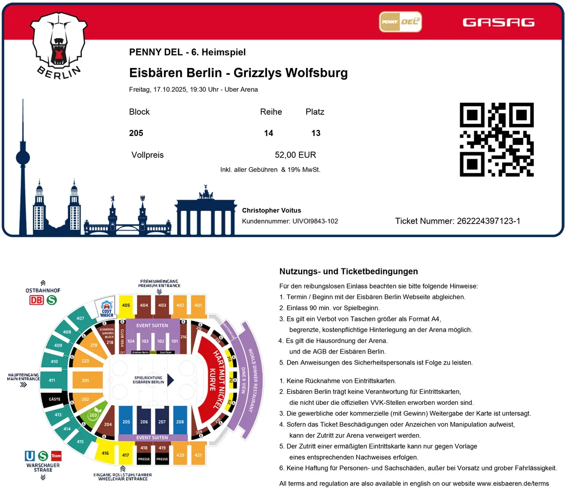 Genug der Systemkritik – nun zum Spocht. Die Eisbären Berlin tragen ihre Heimspiele in der Uber-Arena aus. Die liegt im Bezirk Friedrichshain im Zentrum von Berlin. 2010 war ich schon mal hier, damals hieß die Halle allerdings noch O2 World (so hieß sie bis 2015, dann bis 2024 Mercedes-Benz Arena und nun seit einem guten Jahr Uber Arena). Und ich glaube, damals war nicht viel Infrastruktur außenrum. Ich kann mich nur an einen großen Parkplatz erinnern. Mittlerweile ist die Gegend dicht bebaut. Es gibt ein großes Einkaufszentrum, zwei Parkhäuser, Hotels und viele Restaurants. Ich habe mal durch den Kalender der Arena geschaut, und da finden an fünf bis sechs Tagen pro Woche Veranstaltungen statt. So spielen neben den Eisbären noch die Basketballer von ALBA hier. Der „Rest“ sind Konzerte, Shows und sonstige Events. Hier scheint somit immer was los zu sein. Zum Geburtstag hat mir meine Mutter ein gemeinsames Sportereignis meiner Wahl geschenkt. Ich hab erst überlegt mit ihr zu VSG Altglienicke - Hallescher FC (irgendwann will ja mal die Regionalliga Nordost komplettieren und der aktuell Altglienicker Ground in Fürstenwalde fehlt mir noch) oder zu Union Klosterfelde - Optik Rathenow zu gehen. Für jemanden, der wie meine Mutter nicht so low-league-affin ist, kann das im nordischen Herbst allerdings eine zähe und kühle Angelegenheit werden. Und dann fiel mir wieder ein, dass es nicht nur Fußball gibt, ich ja erst kürzlich einen grandiosen Sieg der Eisbären gesehen habe und ich mal wieder voll Lust auf ein Heimspiel habe. Und so fiel die Wahl auf das heutige Spiel der Eisbären gegen die Grizzlys aus Wolfsburg. Da es ein Geschenk war, hat meine Mutter sich nicht lumpen lassen und wir hatten Premium Plätze. Top. Die Fankleidungsquote lag heute bei guten 95 %. Fast jeder hatte mindestens ein sichtbares Eisbärenutensil am Körper – Trikot, Schal, Basecap oder alles zusammen. Das hatte ich so nicht erwartet und ich fand es super. Wir, die nichts hatten, sind definitiv heute als Touristen aufgefallen.Vor dem Spiel gab es eine ordentliche Show. Weit vorher läuft unglaublich laute Musik. Wenn es dann Richtung Spiel geht und der Hallensprecher übernimmt, wird zur Einstimmung ein emotionaler „Wir-sind-Berlin“-Trailer präsentiert. Und zum Einlauf der Spieler gibt es eine Feuershow.