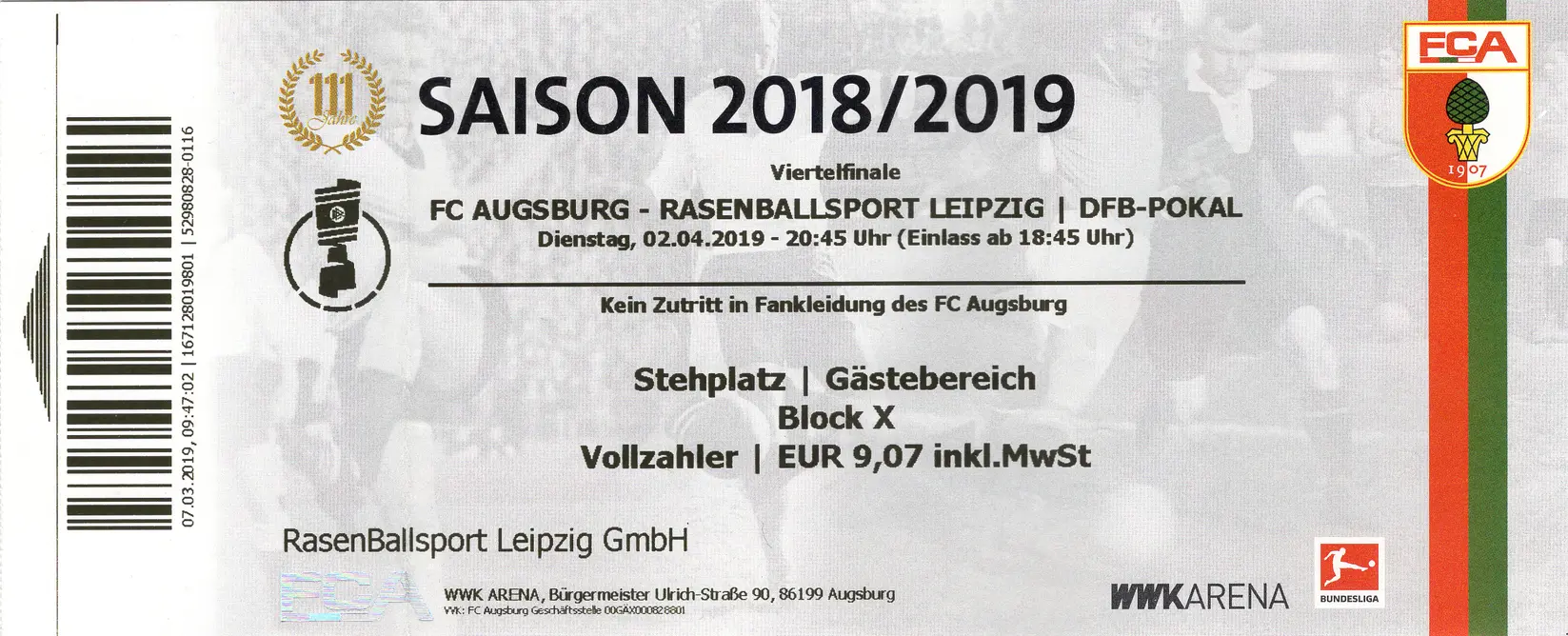 Wie es im Viertelfinale so ist, gibt es 14 mögliche Paarungen für eine Mannschaft - sieben mögliche Gegner, mit jeweils Heim- und Auswärtsspiel. Von den sieben Mannschaften fehlte mir nur noch das Stadion des FC Augsburg und somit stand meine Wunschpaarung fest. Eine Paarungs-Ziehungs-Wahrscheinlichkeit von gut sieben Prozent war nicht viel, doch ich hatte Glück. Jubel auf der Wohnzimmercouch. So, dann musste dieses Viertelfinale eben mit mir stattfinden. Gerechnet hatte ich mit wenigen hundert Fans im Gästeblock. Doch wollten wohl noch mehr Geschichte schreiben und so waren gut 1500 Leipziger in der Fuggerstadt.