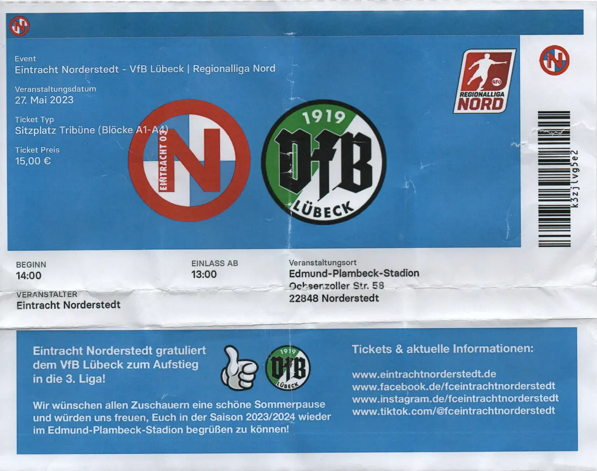 Von den 1675 Zuschauern schätze ich, dass mindestens 1000 aus Lübeck angereist waren. Ist mit einer guten Stunde Anfahrt auch eine eher kurze Anfahrt. Die Lübecker hatten ungefähr das halbe Stadion für sich. Die Hälfte der Gerade als Gästeblock, die nicht singenden Fans standen hinter dem Tor. Und auch auf der Haupttribüne gab es neben dem Gästebereich am Rand noch viel grüne Fankleidung zu sehen. Norderstedt hat keine Fanszene. Außer ein paar Einlaufkinder mit Klatschpappen gab es da keine Stimmung. Ganz anders Lübeck, die haben durchweg gesungen und Fahnen geschwenkt. Das war sehr ansehnlich.Auch das Spiel war echt sehenswert. Beide Mannschaften wollten gewinnen und es gab hochkarätige Chancen auf beiden Seiten. Das muss ein recht hoher xG-Wert gewesen sein. Trotzdem stand es nach 90 Minuten noch 0:0, was ich bei dieser Chancenfülle schon recht ungewöhnlich fand. Mitte der zweiten Halbzeit, so schien es, war dann Lübeck klar, dass der HSV II sein Heimspiel verlieren kann (sie lagen bereits früh 0:1 hinten). Für Lübeck bot sich also die große Chance, die Meisterschaft zu holen. Nur brauchten sie dafür halt einen Sieg. Je länger das Spiel dauerte, desto schneller spielten sie. Und dann, in der 94. Minute, passierte es tatsächlich! Felix Drinkuth (hat schon 29 Drittligaspiele für den FSV Zwickau absolviert) erzielte das Tor zur Meisterschaft. Großer Jubel und ein perfekter Abschluss der Saison.