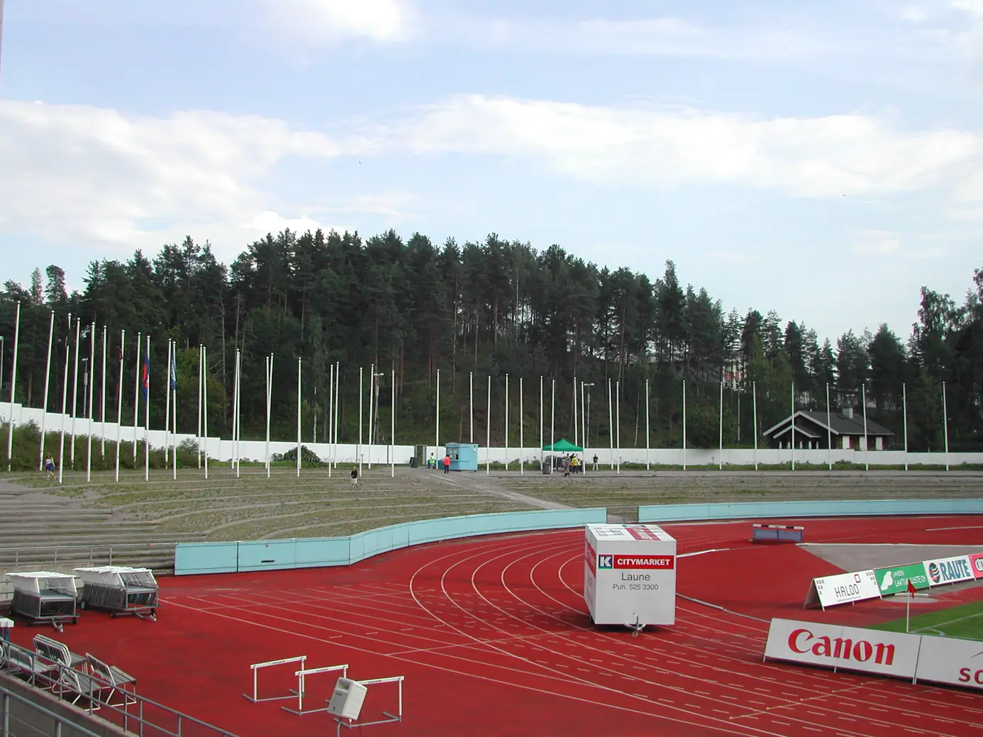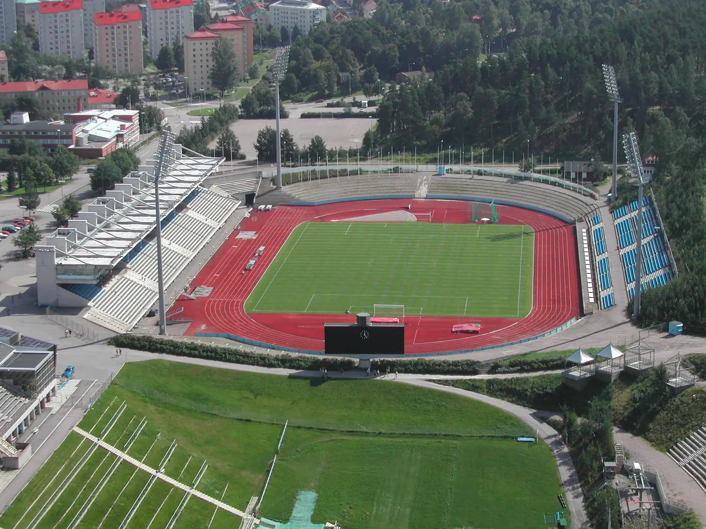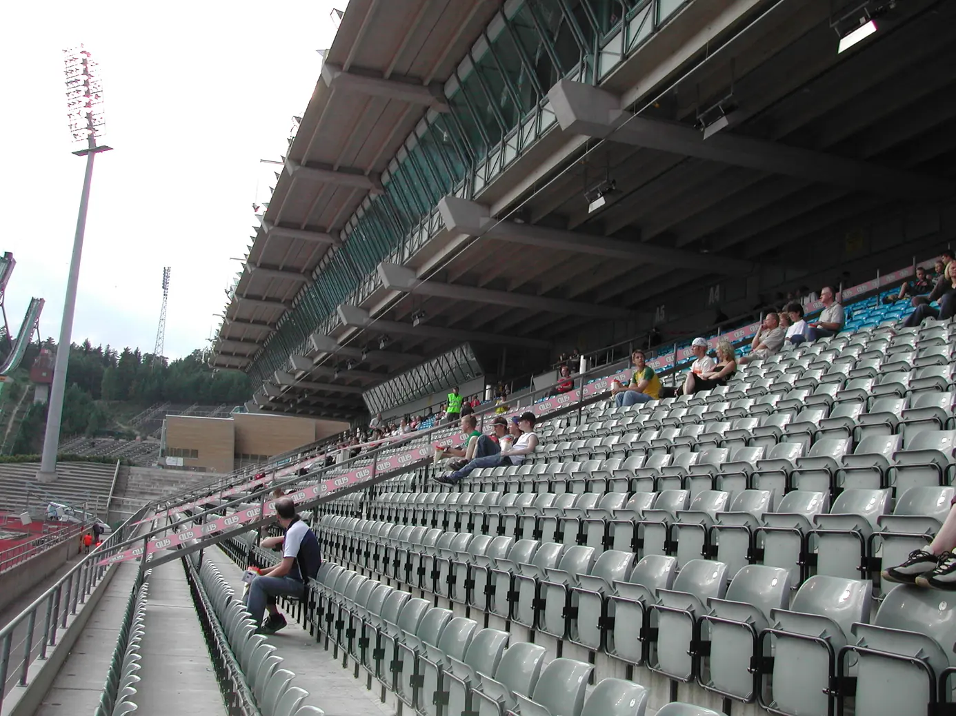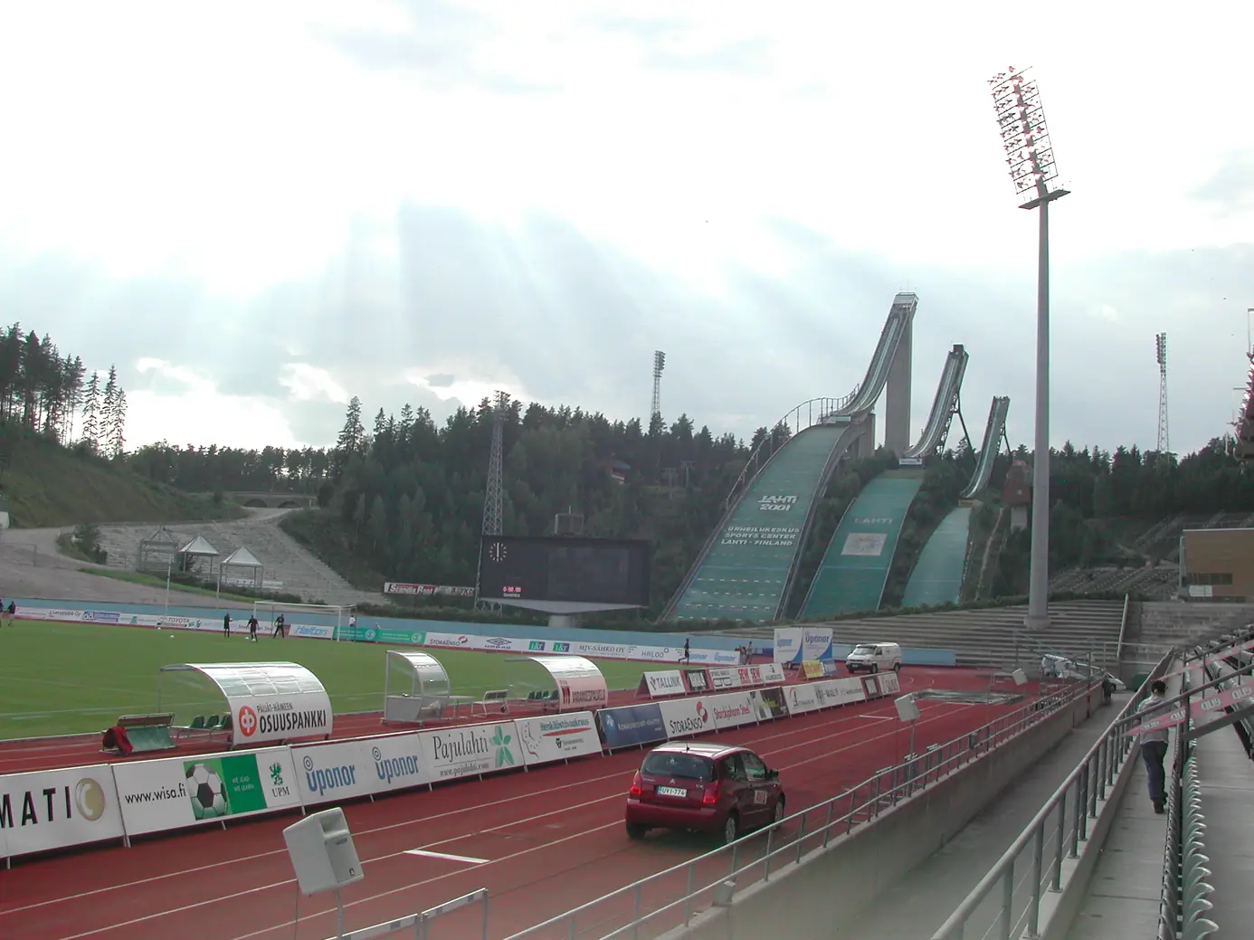 Für Fußball ist Lahti ja nicht wirklich bekannt, für Wintersport schon viel mehr. Jedes Jahr finden hier diverse Weltcups in Biathlon, Langlauf und Skispringen statt. 2001 war Lahti bereits zum sechsten Mal Austragungsort der Nordische Ski-WM. Sehr beeindruckend fand ich die Salpausselkä-Schanze. Eigentlich ist es ein Komplex aus drei Schanzen. Die Hauptschanze ist ein HS 130 (Großschanze), die beiden anderen sind HS 97 (Normalschanze) und K60. Bei der Anfahrt auf Lahti sind sie schon weit vom Vesijärvi zu sehen. Als Besucher darf man auf die Spitze der Großschanze. Was für eine Aussicht. Zum einen eröffnet sich ein herrlicher Blick auf den Vesijärvi, zum anderen liegt direkt hinterm Schanzenauslauf das Lahden Stadion. Das ist das erste Mal, dass ich ein Stadion aus der Luft gesehen habe. Sehr beeindruckend.