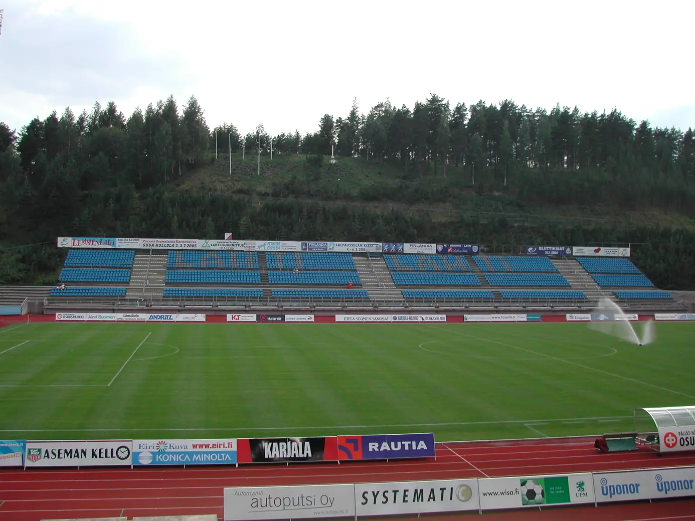 Vielleicht liegt es an diesem Blick, oder am schönen Wetter, oder daran, dass ich in Urlaubsstimmung war – dieses Stadion kommt in meiner Top-X Liste ganz weit nach oben. Ich bevorzuge eh Stadien mit verschiedener Tribünenarchitektur. Im Lahden Stadion besitzen Haupt- und Gegentribüne ein recht unterschiedliches Erscheinungsbild. Und die Kurve ist wieder ganz anders. Das ziehe ich dem Ratinan Stadion in Tampere, bei welchen alles aus einem Guss ist, deutlich vor.