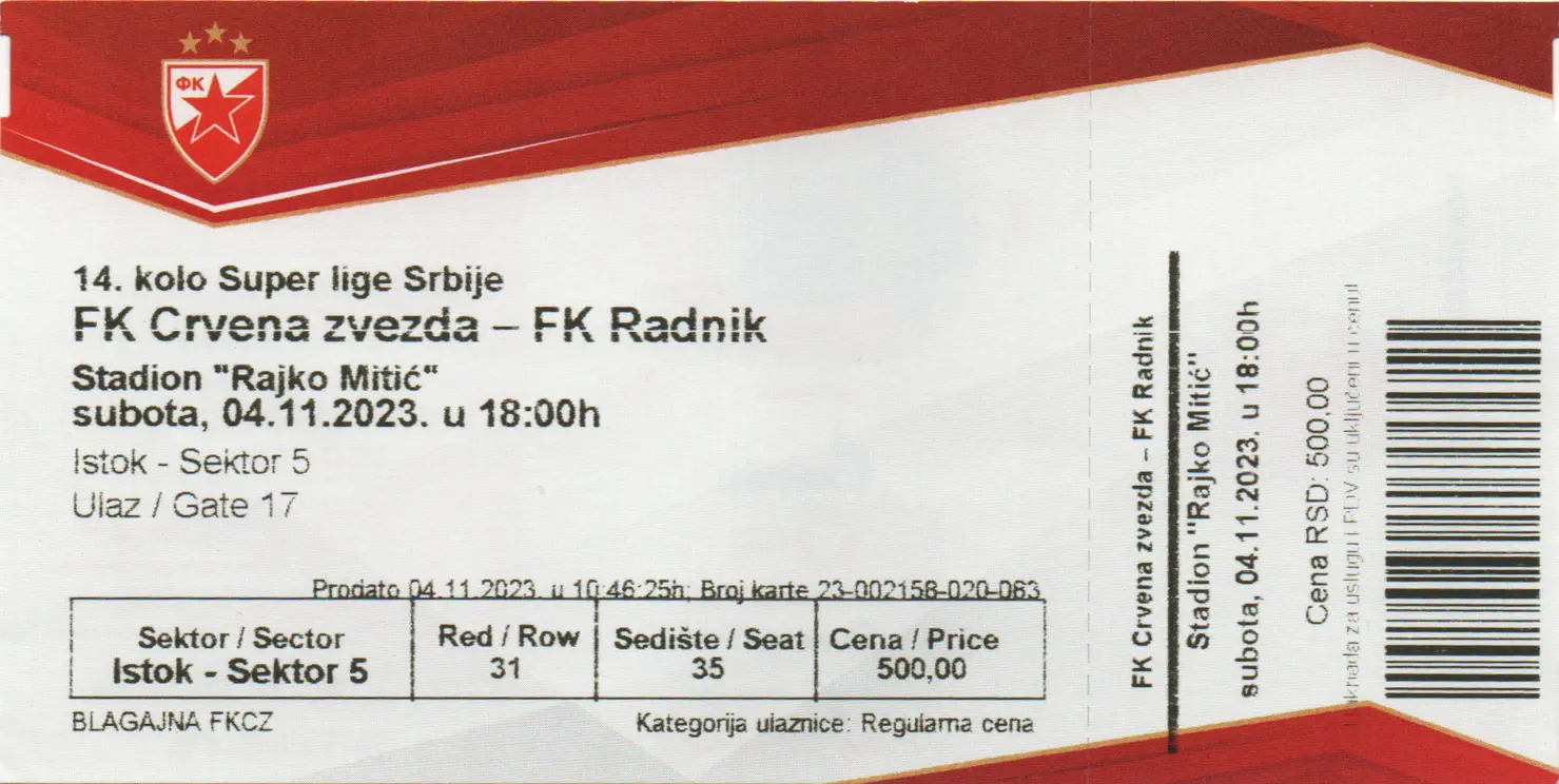 Die Ticketpreise sind krass niedrig. Also auch im Vergleich zur dritten Liga heute Nachmittag. Bei Rad kostete das Ticket 300 Dinar, auf der Gegengerade bei Roter Stern (also zentral und beste Sicht) gerade mal 500 Dinar. Umgerechnet sind das 4,30 Euro. Interessant ist auch der geringe Unterschied zwischen Gerade und Kurve. Ein Ticket für die Kurve kostet gerade mal 100 Dinar weniger, also 400 Dinar. In den europäischen Topligen ist der Preisunterschied zwischen Kurve und Tribüne deutlich größer. Bis 20 Minuten vor Anpfiff war das Stadion noch leer, erst dann füllte sich die Kurve ganz gut. Der Fanblock stand gut kompakt und dann gab es richtig gute Stimmung mit einer ordentlichen Pyroshow. Schon dafür hat sich der Besuch gelohnt. Wenn das mit 3000 Zuschauern schon so stimmungsvoll ist, kann ich mir im Ansatz vorstellen, wie es im Derby gegen Partizan abgeht.Das Spiel war wie erwartet einseitig. Surdulica hat im 5-4-1 gemauert und Roter Stern hat versucht den Beton zu knacken. Das werden selten schöne Spiele. War auch heute dann sportlich eher zähe Kost. Highlight war der Anschlusstreffer für Surdulica zum 2:1. Ein perfekter Distanzschuss aus dem Nichts und plötzlich war es doch nochmal spannend. Naja, vom Ergebnis her, vom Spiel her nicht wirklich. Surdulica konnte auch danach keinen Druck aufbauen. Kurz vor Schluss gab es noch einen Elfmeter für Crvena zvezda und damit war der Deckel drauf. Pflichtsieg.