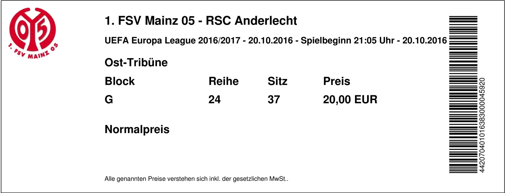 Es ist Europapokal und keiner geht hin. “Keiner” ist natürlich übertrieben, aber ein Straßenfeger schien die heutige Partie in Mainz nicht zu sein. Gut 21.000 Zuschauer fanden den Weg in die Opel-Arena, die bei meinem letzten Besuch noch Coface Arena hieß. Bei einem Fassungsvermögen von 27.000 bei internationalen Spielen war die Partie somit nicht ausverkauft. Ein Ticket auf der Hintertortribüne mit perfekter Sicht gab es für erschwingliche 20 Euro - für ein Bundesligaspiel muss man in Mainz 50 % mehr bezahlen. Der FSV Mainz 05 spielt dieses Jahr zum ersten Mal in der Gruppenphase der Europa League und niemand weiß, ob das so schnell wie passieren wird. Bei einer Gruppe mit St. Etienne, RSC Anderlecht und FK Qəbələ ist Anderlecht für mich ein eher attraktiver Gegner. Da hätte ich erwartet, dass die Tickets heiß begehrt sind - also ich war wegen des internationalen Auftrittes da. Aber anscheinend hab ich mich da getäuscht und die Europa League ist/bleibt einfach ein Nischenprodukt.