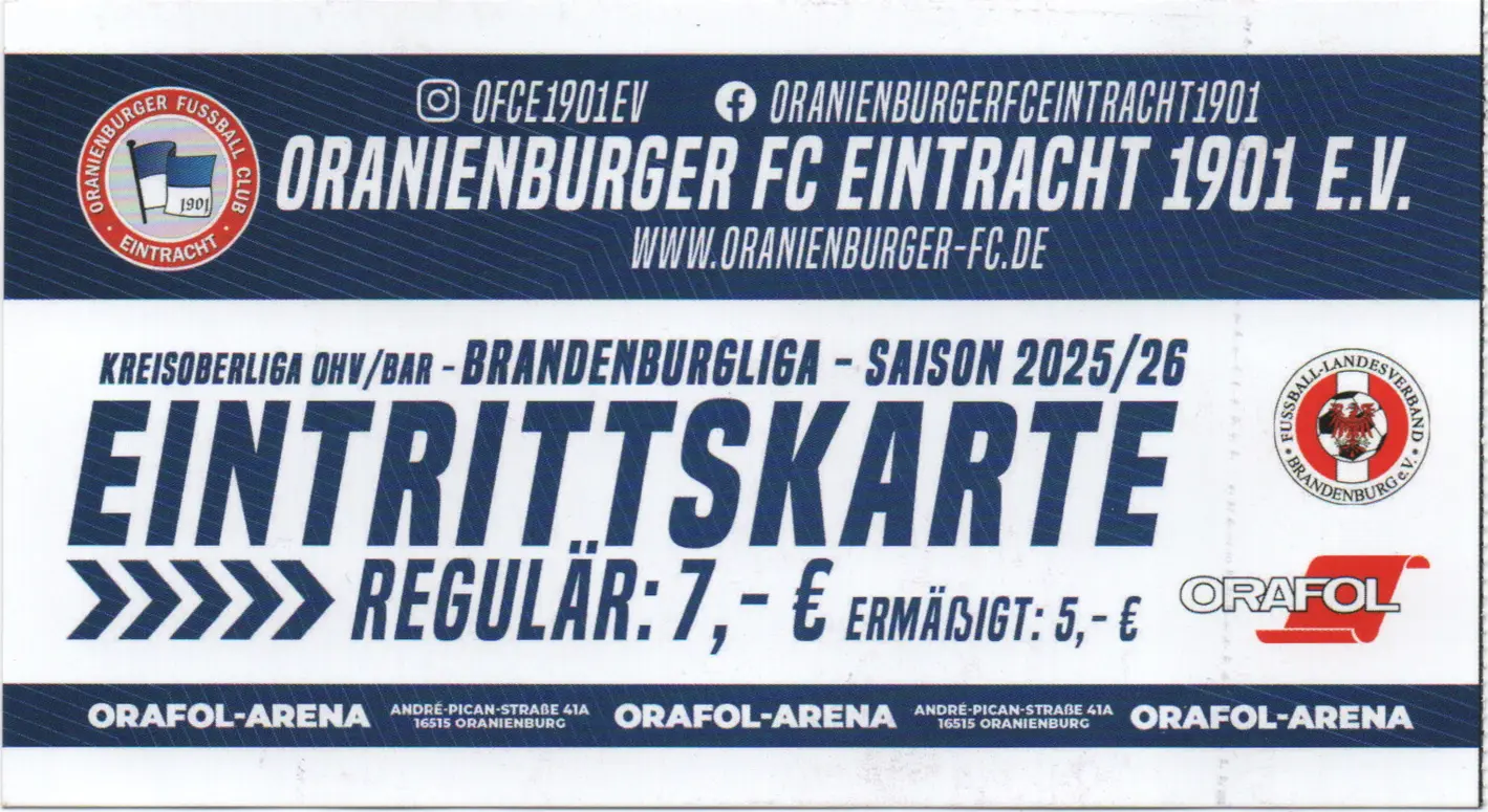 Der Oranienburger FC Eintracht wurde 1901 gegründet und wird damit kommendes Jahr 125 Jahre alt. Überregionale Erfolge blieben dem Verein zwar bis heute verwehrt, doch 1983 und 1984 durften sie immerhin an den Aufstiegsspielen zur DDR-Liga (zweithöchste DDR-Spielklasse) teilnehmen. Beide Male verpassten sie den Aufstieg. 2002 gewannen die Oranienburger die Brandenburgliga und schafften damit den Aufstieg in die NOFV-Oberliga. Wobei sie als abgeschlagener Tabellenletzter direkt wieder abstiegen. Nach einer Insolvenz 2003 löste sich die Fußballabteilung aus der SG Eintracht Oranienburg heraus und gründete den heutigen Oranienburger FC Eintracht. Seit 2013 spielt der Verein durchgängig in der Brandenburgliga.