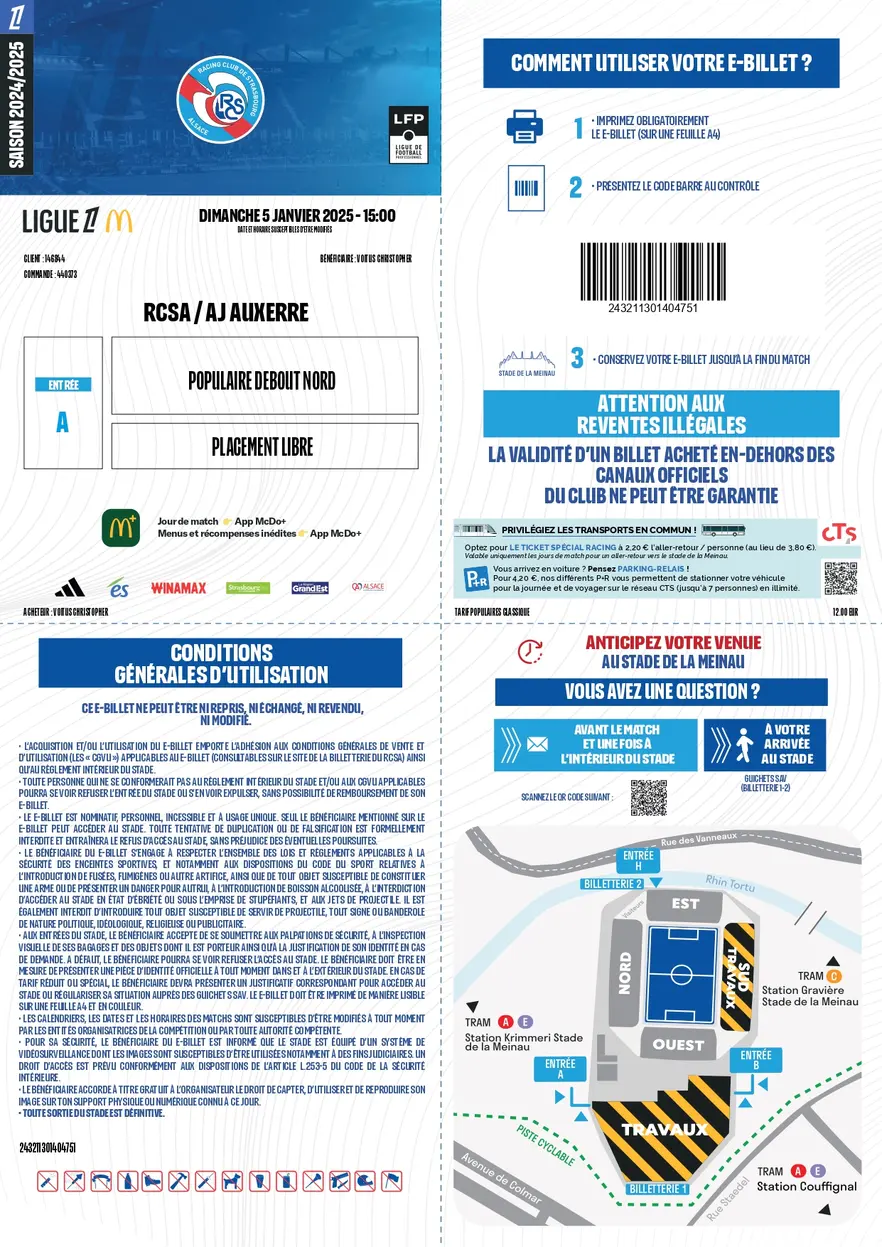 Die vergangenen zwei Saisons war ich jeweils um Weihnachten/Neujahr bei Racing Strasbourg (2022/23 gegen Troyes, 2023/24 gegen Lille). Frankreich kennt keine Winterpause und da bietet es sich an, also wenn ich eh Zeit habe, mal einen Ausflug ins nahe gelegene Strasbourg zu unternehmen. Und auch diese Saison passt der Spielplan gut. Am ersten Januarwochenende kam AJ Auxerre ins Stade de la Meinau. Mal schauen, ob daraus eine Tradition erwächst.