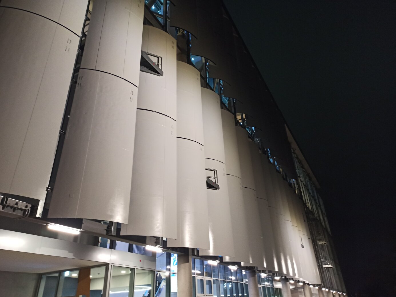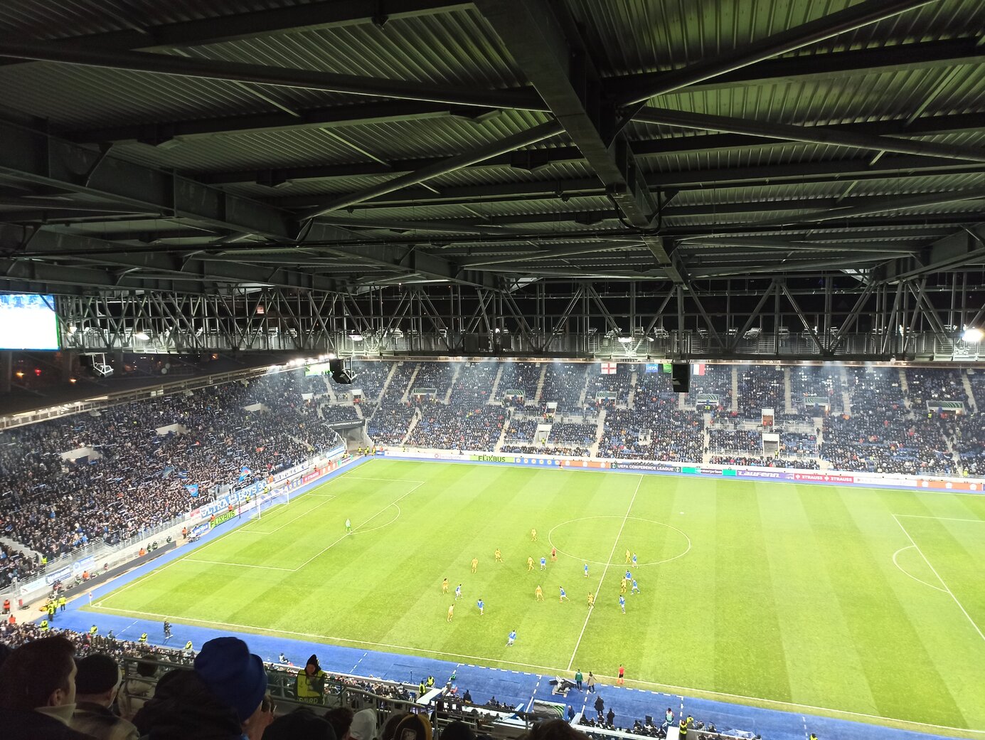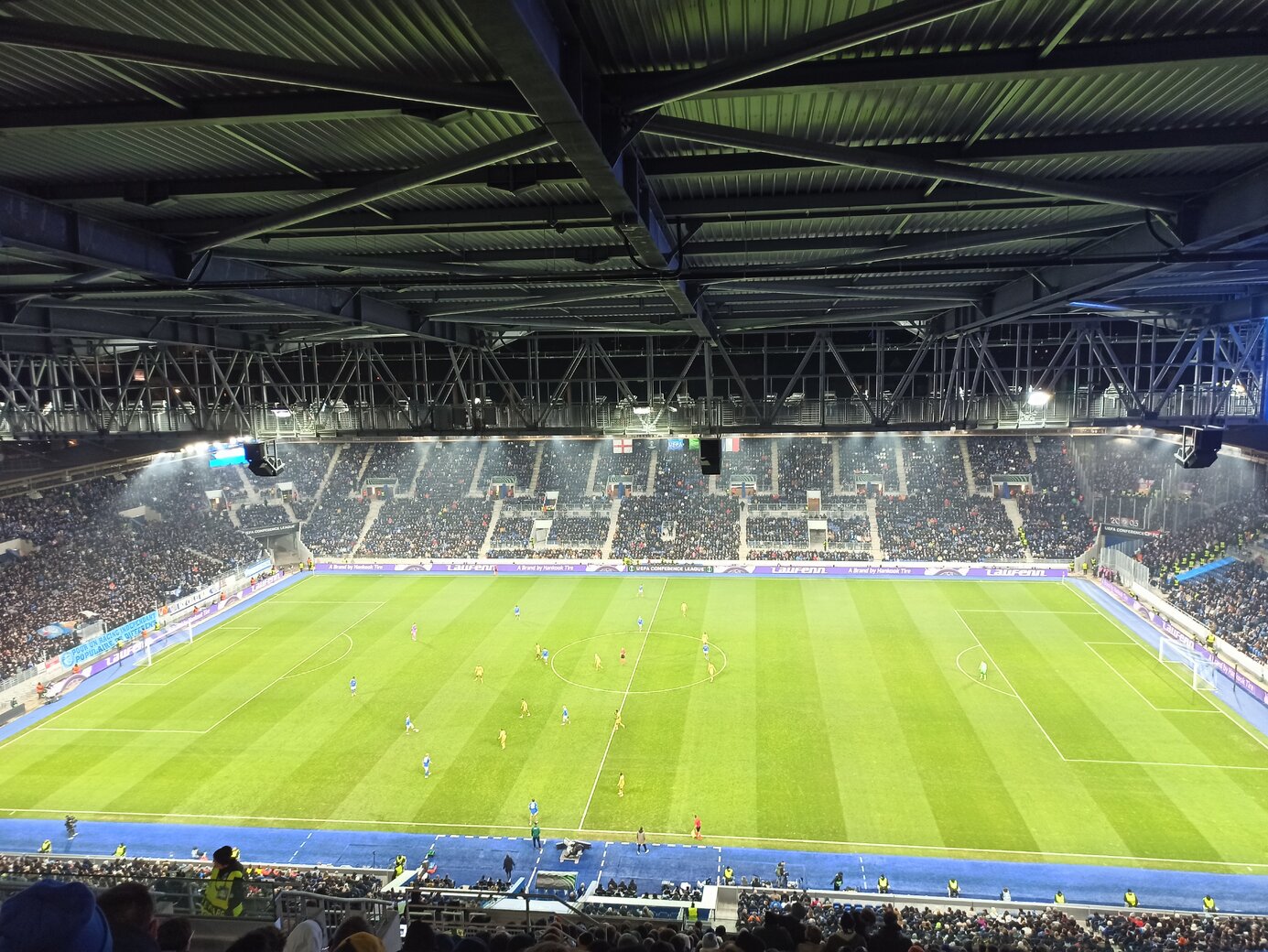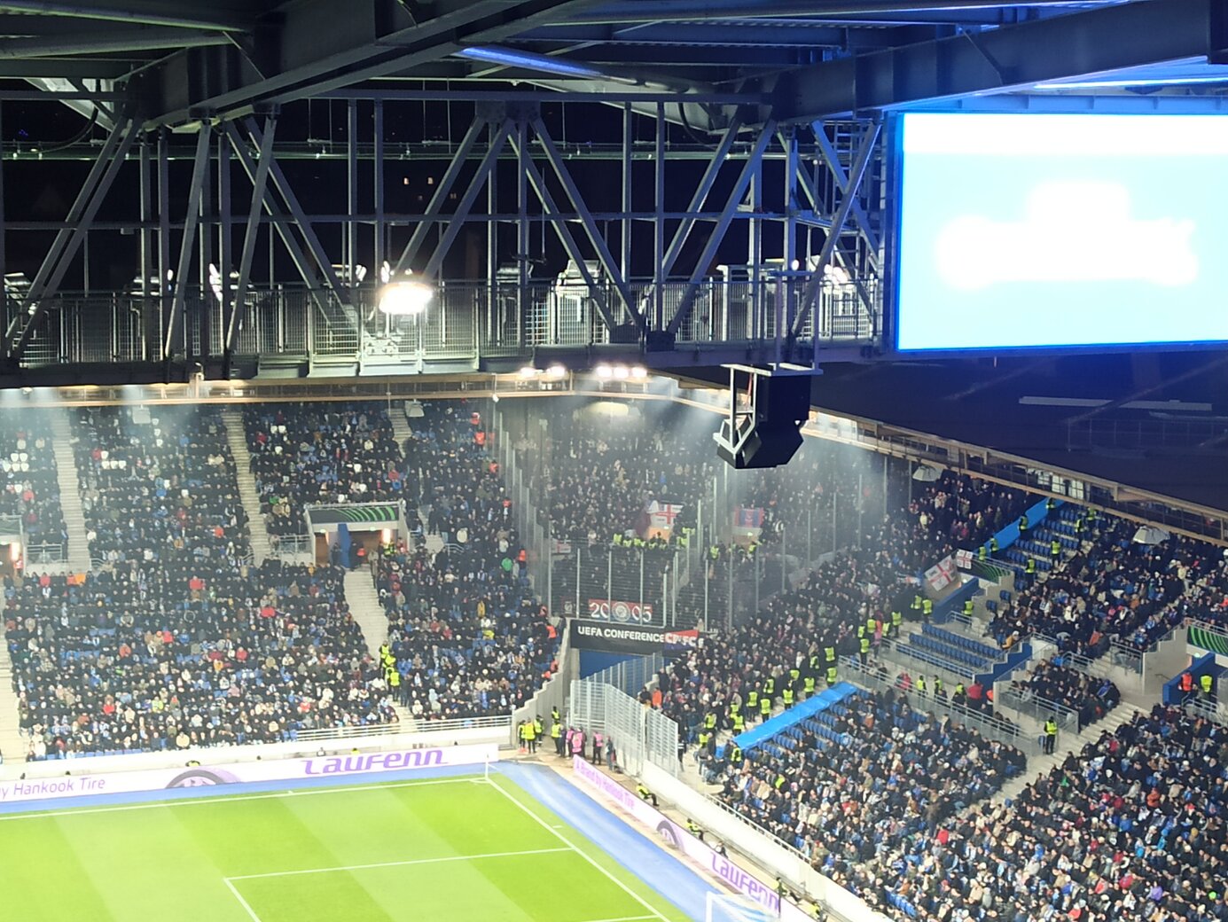 Wie auch immer, Racing beendete die Saison 2024/25 auf Platz 7 und qualifizierte sich damit für die Play-offs zur UEFA Conference League. Dort setzten sie sich gegen Bröndby IF mit einem 0:0 zu Hause und einem 3:2 Auswärtssieg durch und erreichten so die Gruppenphase. An einem Montag im September gingen die Karten für die Dreier-Heimspielserie um 14:00 Uhr in den freien Verkauf. Um 14:15 Uhr war das Stadion ausverkauft. Ich war zum Glück beim Run dabei und habe zwei Tickets für meinen Sohn und mich abgestaubt. Auf der nigelnagelneuen Haupttribüne. Im Januar war diese Tribüne noch Baustelle und wurde im Sommer fertiggestellt. Im Vergleich zu davor wurde sie mit einem zusätzlichen Rang deutlich erweitert und bietet nun 8.000 Zuschauern Platz.Unsere Karten sind in der drittletzten Reihe. Verglichen mit dem Rest des Strasbourger Stadions ist das schon weit weg, aber objektiv hat man von dort gute Sicht.