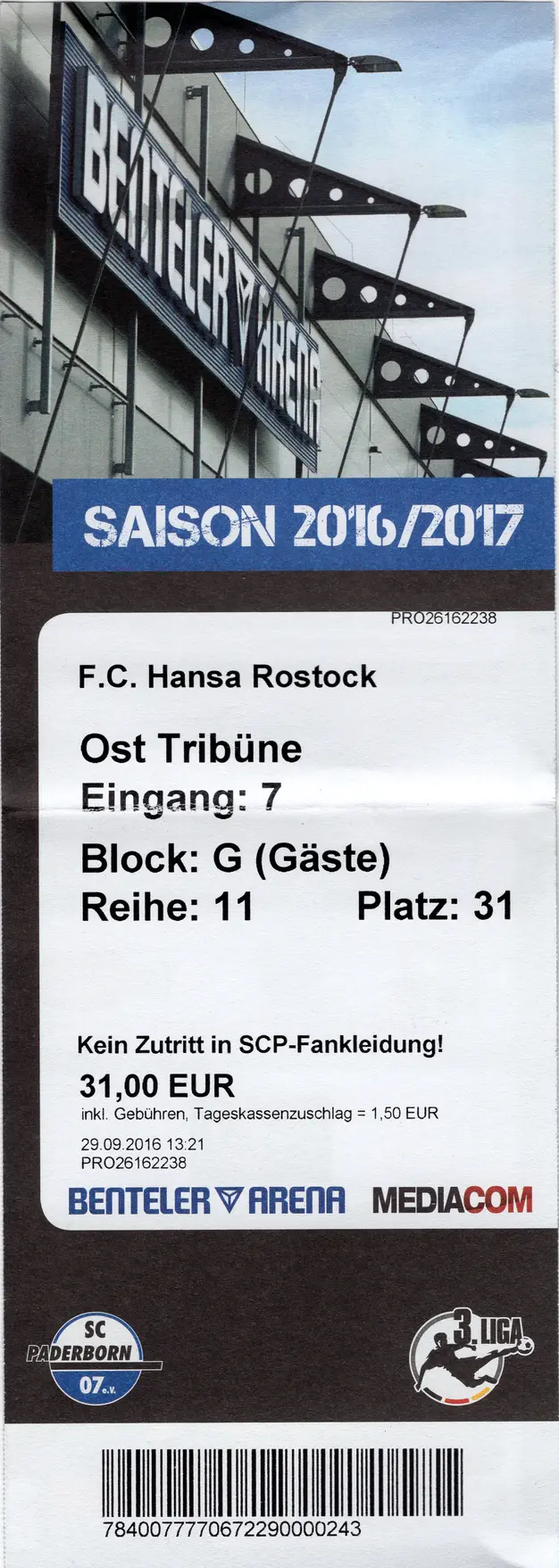 Mal wieder Freitag, mal wieder 1.300 Bekloppte im Gästeblock. Und dies heute in der Benteler-Arena beim SC Paderborn 07. Die Benteler-Arena ist ein Stadionneubau und wurde 2008 eingeweiht. Es fasst aktuell 15.000 Zuschauer und könnte bei Bedarf auf 20.000 Zuschauer ausgebaut werden. Das Stadion ist ganz okay. Es wirkt recht geschlossen und erzeugt somit fast ein Hallengefühl. Jemand im Block meinte, wenn man noch einen Deckel draufmacht, ist es eine Fischbüchse. Besser kann man das Stadion eigentlich nicht beschreiben. Der Preis von 31 Euro für einen Sitzplatz (auch für Gäste) finde ich für die 3. Liga recht hoch. Neben der aktuell sportlichen Misere von Paderborn ist vielleicht auch das ein Grund, dass heute nicht mal 5.000 Heimzuschauer kamen.