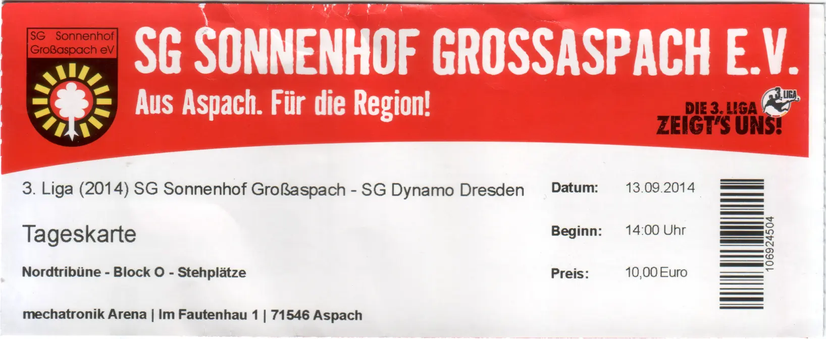 Es war mein erster Besuch in der mechatronik Arena, d.h. es war ein weiterer Ground in meiner Sammlung. Er war: