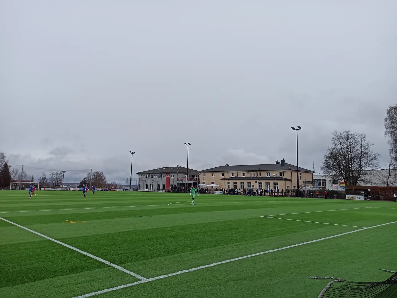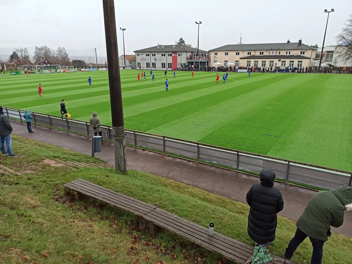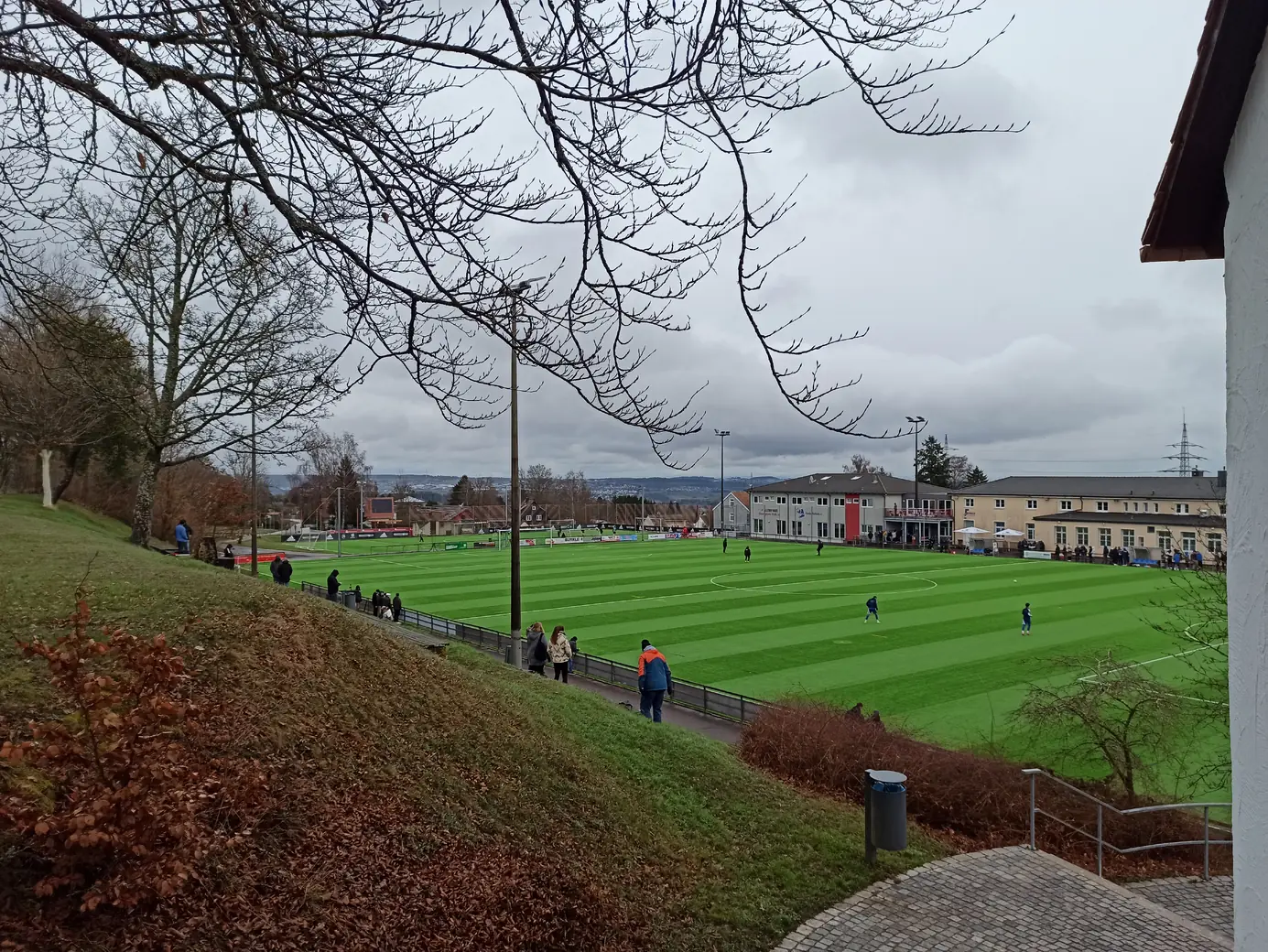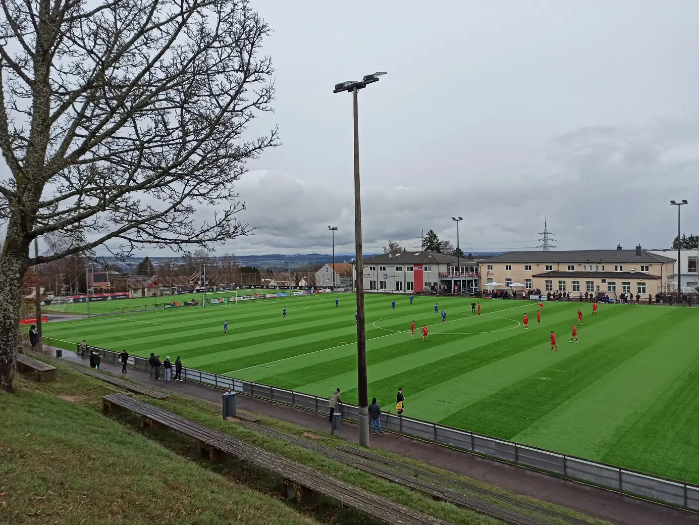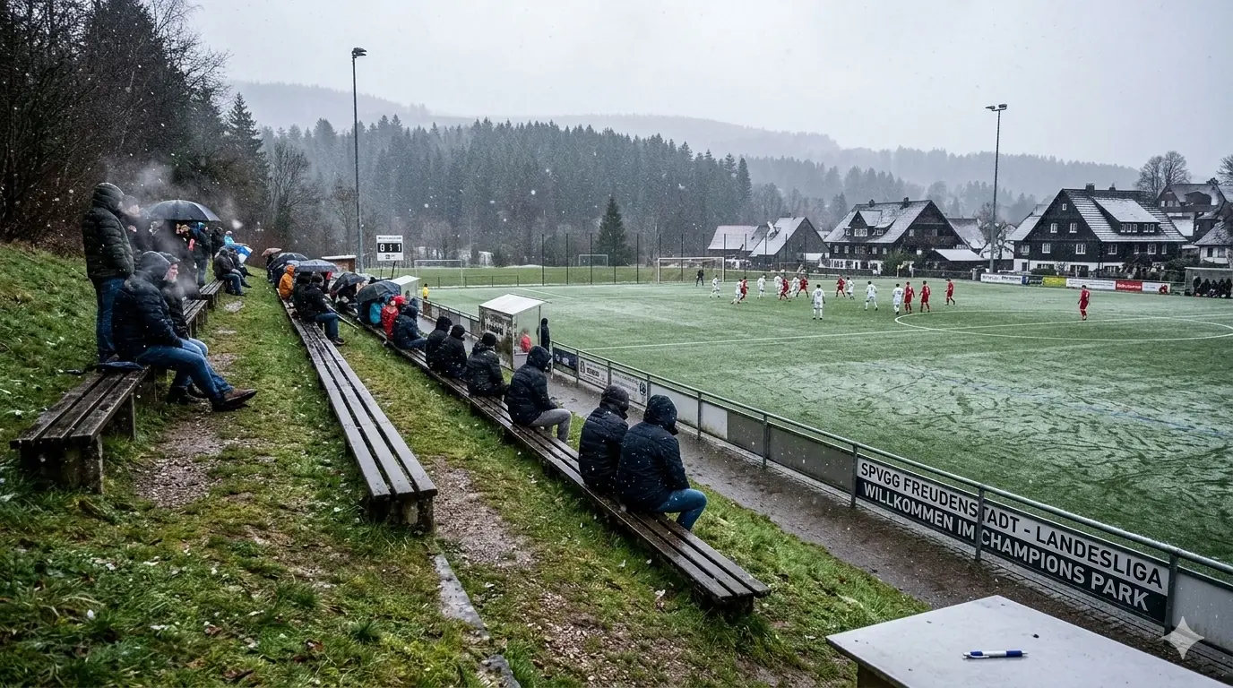 Die Spvgg Freudenstadt trägt ihre Spiele im Champions Park aus. Der Champions-Park ist ein Sport- und Freizeitzentrum, das Trainingslager für Mannschaften in fast allen Sportarten, Camps, Schullandheime sowie Events und Turniere anbietet. Zur Anlage gehören ein Rasen- und ein moderner Kunstrasenplatz (beide mit FIFA-Maßen von 105 x 68 Meter), Beach-Felder, Soccer-Courts, ein Hallen- & Freibad sowie zwei Sporthallen. Während der EM 2024 hat die dänische Nationalmannschaft den Champions Park in Freudenstadt als Trainingsstandort genutzt. Laut Aussage des Kassierers spielt die Spvgg Freudenstadt wetterabhängig sowohl auf Rasen als auch auf Kunstrasen. Nachdem ich auf der Anreise durch Schneetreiben gefahren bin, war natürlich klar, dass die heutige Partie auf Kunstrasen stattfinden wird. Das hatte ich eingeplant und auch dieser Platz ist definitiv ein sehenswerter Ground. Sehr schön ist der recht steile Hang an einer Längsseite, auf dem sich drei Reihen mit Bänken befinden. Zum einen sieht das von der Gegenseite nach was aus, zum anderen hat man als Zuschauer von dort bei der erhöhten Lage eine perfekte Sicht aufs Spiel. Apropos Spiel. Das Spiel startete mit einer Großchance von Freudenstadt. Ein Fernschuss, den der Mühlheimer Keeper niemals erreicht hätte, drehte sich an den Innenpfosten, lief vor der Torlinie entlang und wurde dort geklärt. Ab dann übernahm der VfL Mühlheim die Initiative und war spielbestimmend. Nachdem es noch torlos in die Halbzeitpause ging, konnte Mühlheim nach gut einer Stunde durch einen Elfmeter in Führung gehen. In der 84. Minute folgte das 0:2, was angesichts der Spielanteile wie die Entscheidung wirkte. Aus dem Nichts kam Freudenstadt zwei Minuten vor Ende der regulären Spielzeit zum Anschlusstreffer, was zu einer hektischen Schlussphase führte. Am Ende blieb es beim Auswärtssieg.Das Wetter war mal wieder eine Mischung aus Wind, Regen und Schneeregen, bei knapp über 2° C. Gemütlich.