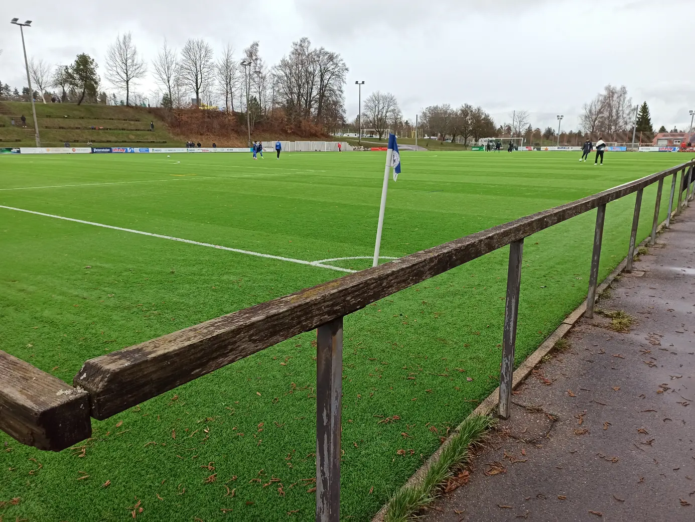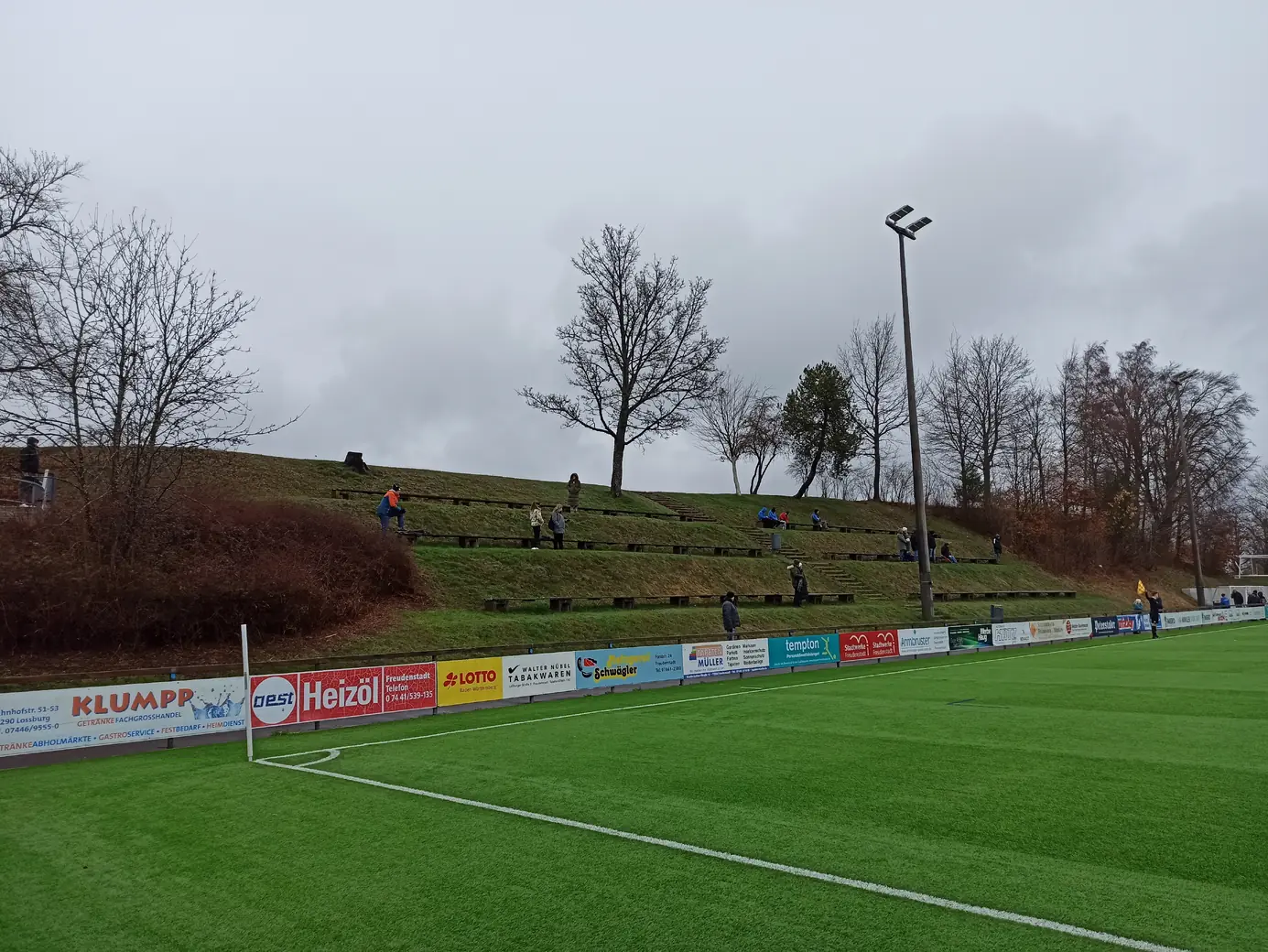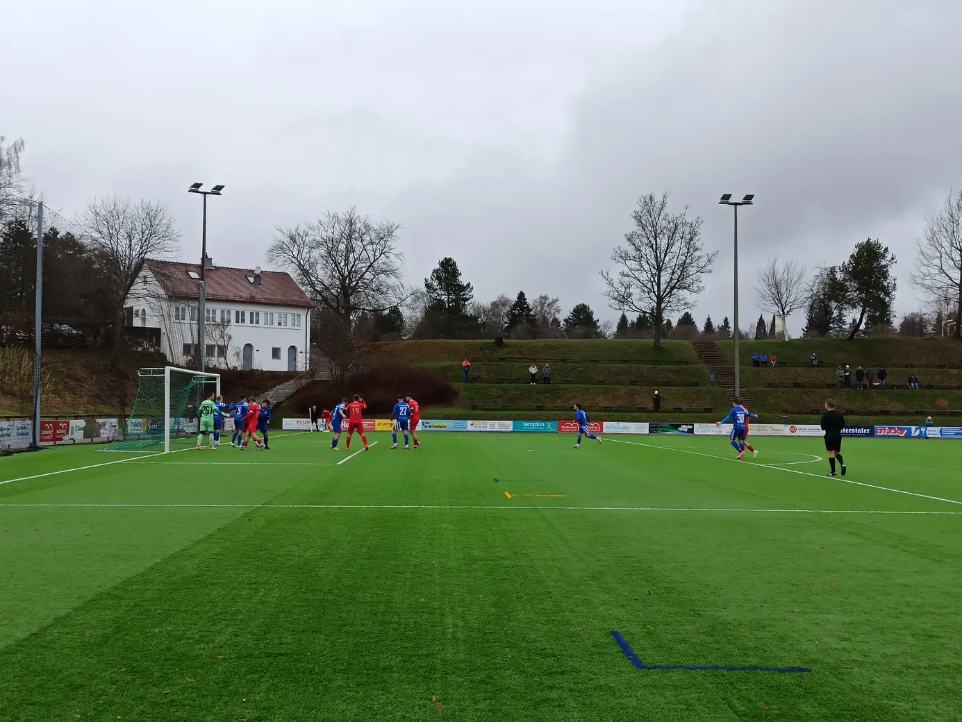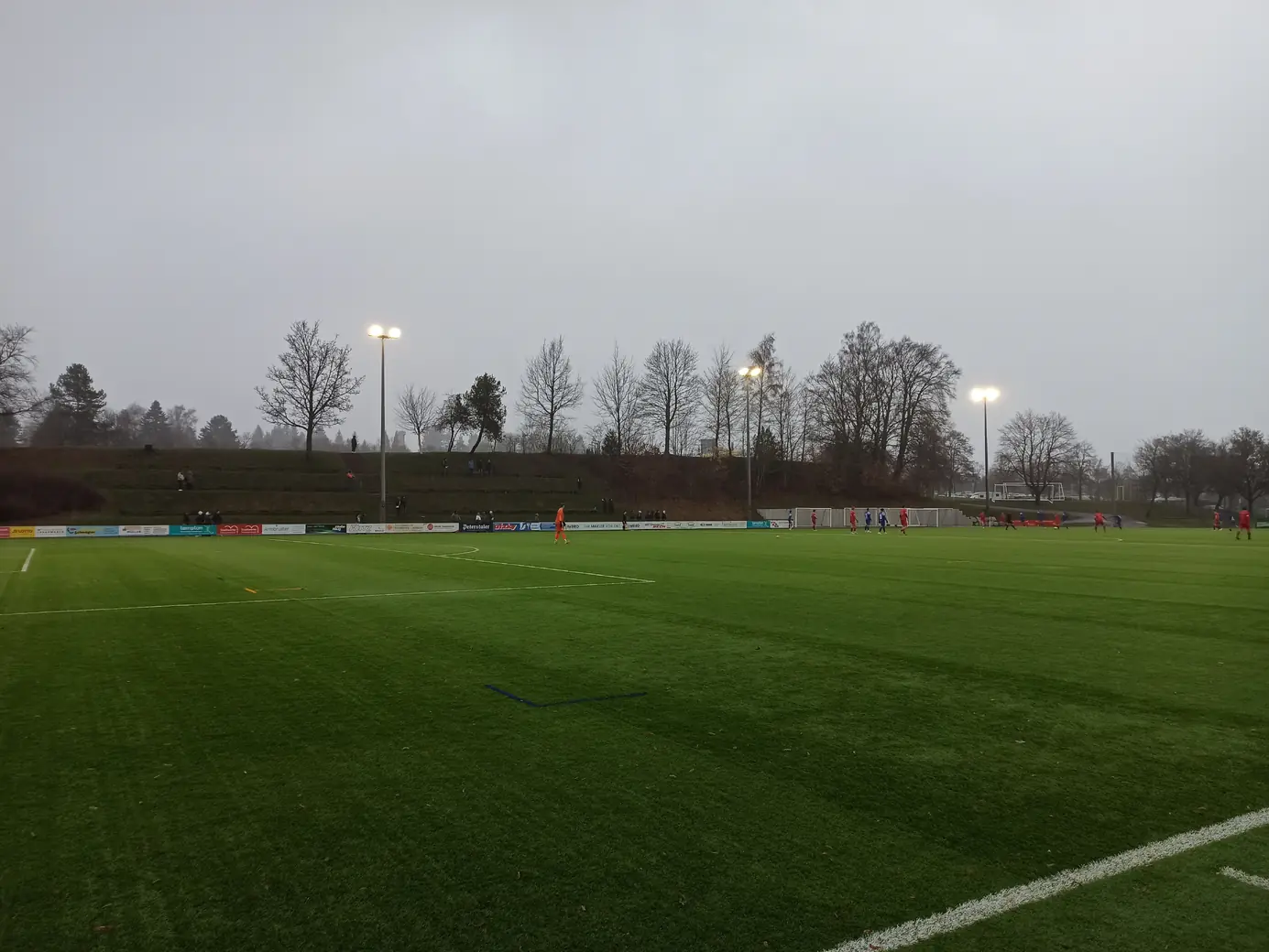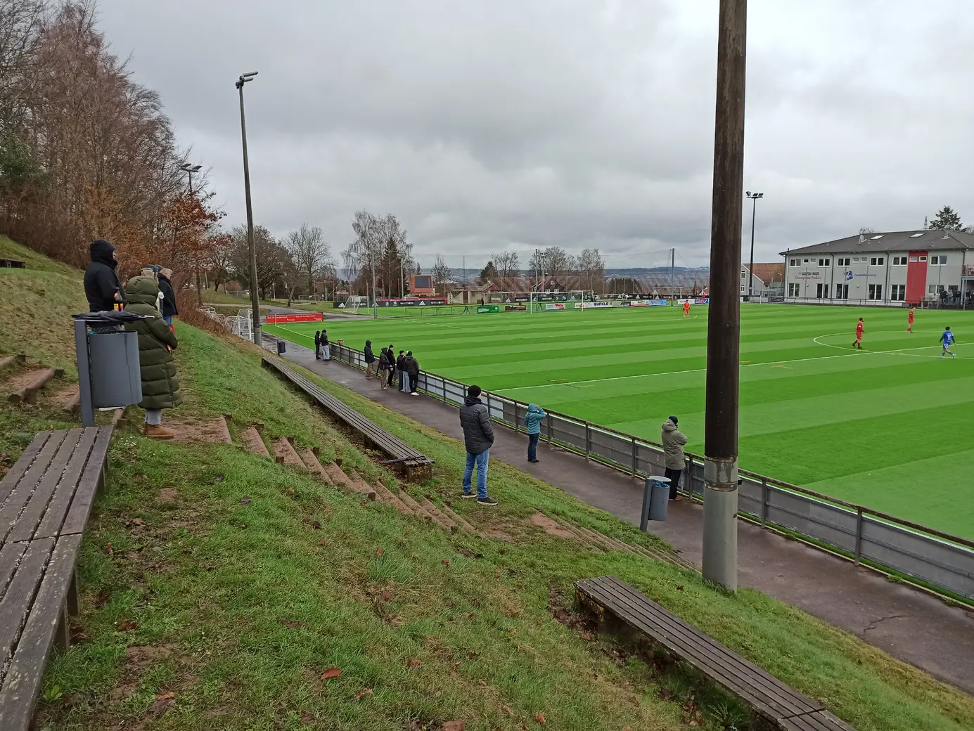 Die Spvgg Freudenstadt trägt ihre Spiele im Champions Park aus. Der Champions-Park ist ein Sport- und Freizeitzentrum, das Trainingslager für Mannschaften in fast allen Sportarten, Camps, Schullandheime sowie Events und Turniere anbietet. Zur Anlage gehören ein Rasen- und ein moderner Kunstrasenplatz (beide mit FIFA-Maßen von 105 x 68 Meter), Beach-Felder, Soccer-Courts, ein Hallen- & Freibad sowie zwei Sporthallen. Während der EM 2024 hat die dänische Nationalmannschaft den Champions Park in Freudenstadt als Trainingsstandort genutzt. Laut Aussage des Kassierers spielt die Spvgg Freudenstadt wetterabhängig sowohl auf Rasen als auch auf Kunstrasen. Nachdem ich auf der Anreise durch Schneetreiben gefahren bin, war natürlich klar, dass die heutige Partie auf Kunstrasen stattfinden wird. Das hatte ich eingeplant und auch dieser Platz ist definitiv ein sehenswerter Ground. Sehr schön ist der recht steile Hang an einer Längsseite, auf dem sich drei Reihen mit Bänken befinden. Zum einen sieht das von der Gegenseite nach was aus, zum anderen hat man als Zuschauer von dort bei der erhöhten Lage eine perfekte Sicht aufs Spiel. Apropos Spiel. Das Spiel startete mit einer Großchance von Freudenstadt. Ein Fernschuss, den der Mühlheimer Keeper niemals erreicht hätte, drehte sich an den Innenpfosten, lief vor der Torlinie entlang und wurde dort geklärt. Ab dann übernahm der VfL Mühlheim die Initiative und war spielbestimmend. Nachdem es noch torlos in die Halbzeitpause ging, konnte Mühlheim nach gut einer Stunde durch einen Elfmeter in Führung gehen. In der 84. Minute folgte das 0:2, was angesichts der Spielanteile wie die Entscheidung wirkte. Aus dem Nichts kam Freudenstadt zwei Minuten vor Ende der regulären Spielzeit zum Anschlusstreffer, was zu einer hektischen Schlussphase führte. Am Ende blieb es beim Auswärtssieg.Das Wetter war mal wieder eine Mischung aus Wind, Regen und Schneeregen, bei knapp über 2° C. Gemütlich.
