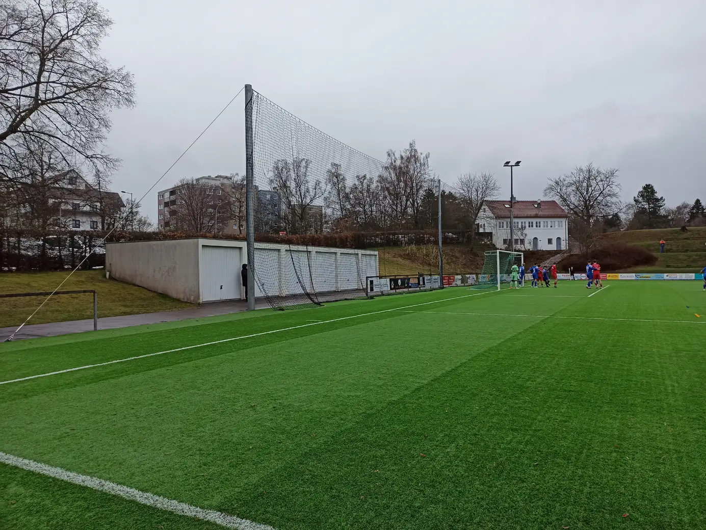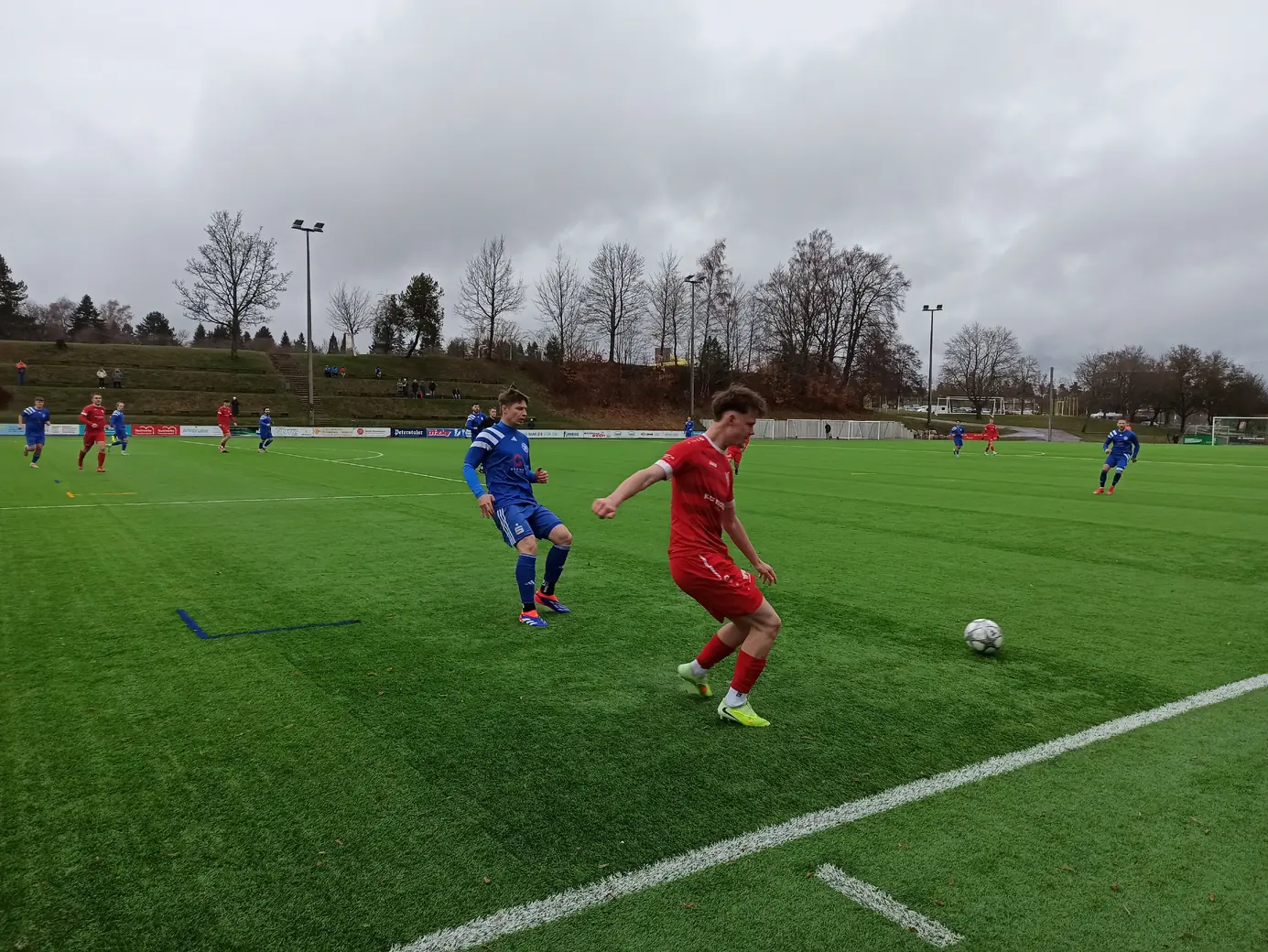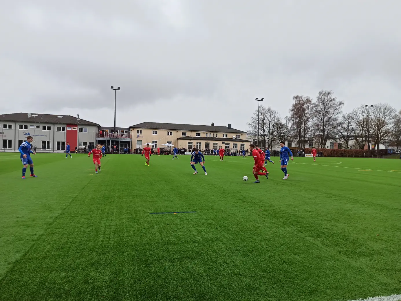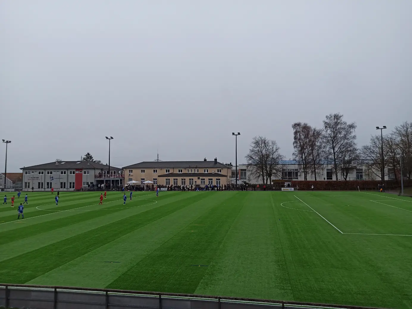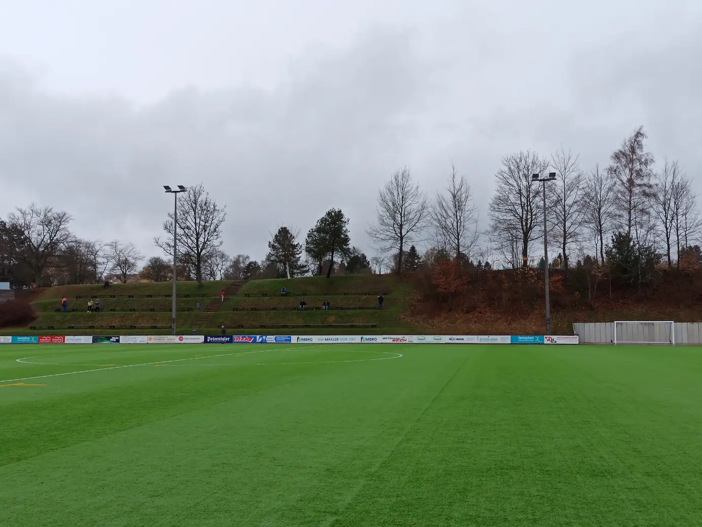 Die Spvgg Freudenstadt trägt ihre Spiele im Champions Park aus. Der Champions-Park ist ein Sport- und Freizeitzentrum, das Trainingslager für Mannschaften in fast allen Sportarten, Camps, Schullandheime sowie Events und Turniere anbietet. Zur Anlage gehören ein Rasen- und ein moderner Kunstrasenplatz (beide mit FIFA-Maßen von 105 x 68 Meter), Beach-Felder, Soccer-Courts, ein Hallen- & Freibad sowie zwei Sporthallen. Während der EM 2024 hat die dänische Nationalmannschaft den Champions Park in Freudenstadt als Trainingsstandort genutzt. Laut Aussage des Kassierers spielt die Spvgg Freudenstadt wetterabhängig sowohl auf Rasen als auch auf Kunstrasen. Nachdem ich auf der Anreise durch Schneetreiben gefahren bin, war natürlich klar, dass die heutige Partie auf Kunstrasen stattfinden wird. Das hatte ich eingeplant und auch dieser Platz ist definitiv ein sehenswerter Ground. Sehr schön ist der recht steile Hang an einer Längsseite, auf dem sich drei Reihen mit Bänken befinden. Zum einen sieht das von der Gegenseite nach was aus, zum anderen hat man als Zuschauer von dort bei der erhöhten Lage eine perfekte Sicht aufs Spiel. Apropos Spiel. Das Spiel startete mit einer Großchance von Freudenstadt. Ein Fernschuss, den der Mühlheimer Keeper niemals erreicht hätte, drehte sich an den Innenpfosten, lief vor der Torlinie entlang und wurde dort geklärt. Ab dann übernahm der VfL Mühlheim die Initiative und war spielbestimmend. Nachdem es noch torlos in die Halbzeitpause ging, konnte Mühlheim nach gut einer Stunde durch einen Elfmeter in Führung gehen. In der 84. Minute folgte das 0:2, was angesichts der Spielanteile wie die Entscheidung wirkte. Aus dem Nichts kam Freudenstadt zwei Minuten vor Ende der regulären Spielzeit zum Anschlusstreffer, was zu einer hektischen Schlussphase führte. Am Ende blieb es beim Auswärtssieg.Das Wetter war mal wieder eine Mischung aus Wind, Regen und Schneeregen, bei knapp über 2° C. Gemütlich.
