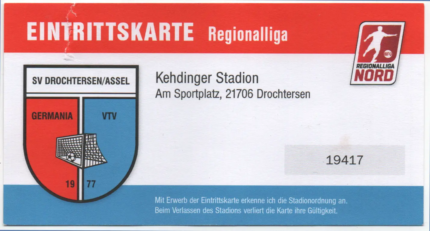 Wikipedia: „Drochtersen ist eine Gemeinde im niedersächsischen Landkreis Stade. Sie liegt südlich der Elbe, etwa 45 km nordwestlich von Hamburg und fast 50 km östlich von Cuxhaven. Sie hat gut 11.000 Einwohner und umfasst große Teile des Südens von Kehdingen.“ Die Gemeinde Drochtersen besteht aus dem Hauptort Drochtersen (5.500 Einwohner), dem Ortsteil Assel (3.600 Einwohner) sowie weiteren Ortsteilen. Der Verein SV Drochtersen/Assel entstand im Jahre 1977 als Zusammenschluss der beiden Vereine TV Germania Drochtersen und VTV Assel. Deswegen auch die beiden Teile im Vereinswappen mit „Germania“ und „VTV“.Ich bin jetzt schon viel in Deutschland rumgekommen, aber Drochtersen und Assel waren mir unbekannt. Aus dem Fußballkontext hab ich das natürlich schon gehört, aber ich hatte keinen Plan wo das liegt. Jetzt weiß ich es und merke wieder: Groundhopping bildet.