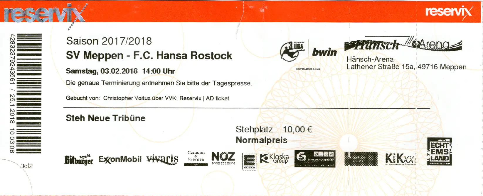 Die 1.500 Gästekarten für die Meppener Hänsch-Arena waren in weniger als 24 Stunden vergriffen gewesen. Ich war wie immer zu langsam und musste mir somit eine Karte über Meppen für die Neue Tribüne besorgen, also so nah wie möglich am Gästeblock. Laut offizieller Ankündigung sollte bei diesem Spiel allen erkennbaren Hansa-Fans (durch Schals, Trikots etc.) der Zugang zu einem anderen Block als dem Gästeblock verweigert werden. Am Eingang durften einige ihre Jacke öffnen und zeigen, dass sie keine Hansa-Fanartikel am Leib haben.