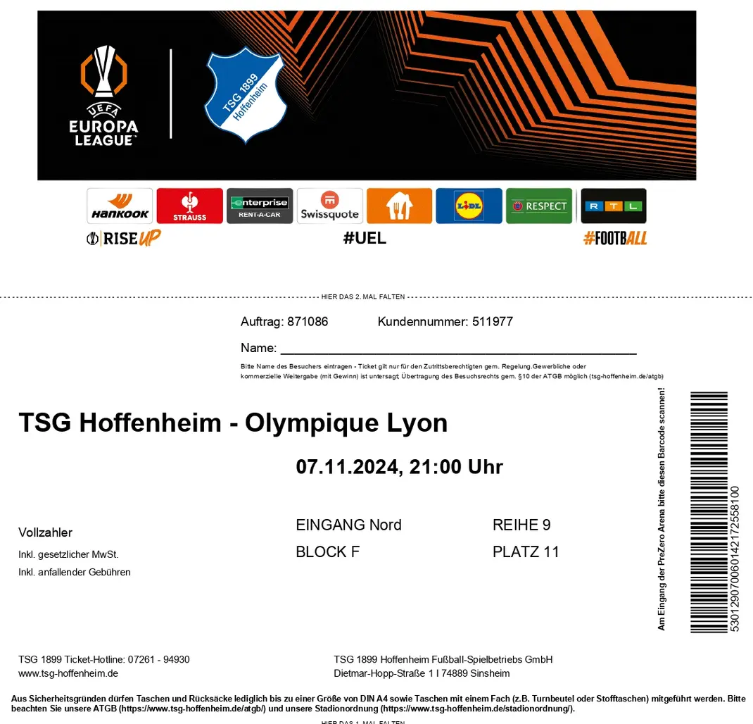 Hoffenheim spielt die Europa League Saison zu Hause gegen Dynamo Kiew, Olympique Lyonnais, FCSB Bukarest und Tottenham Hotspur FC. Das klang verlockend. Obwohl mir Hoffenheim lang wie breit ist, hab ich mir wegen der Gegner zwei Vierer-Tickets geholt. Kiew hatte ich keine Zeit und hab die Tickets weitergegeben, aber die anderen drei Begegnungen finden mit mir statt. Ich habe mir die Tickets direkt neben dem Gästeblock geholt, in der Hoffnung hier mittendrin zu sein.