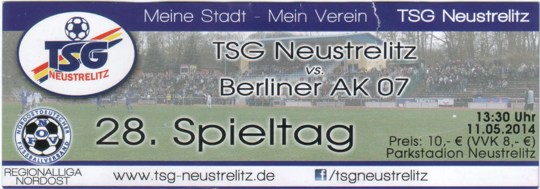 Drei Spieltage vor Schluss hatte die TSG Neustrelitz 9 Punkte Vorsprung vor dem 1. FC Magdeburg. Neustrelitz benötigte also noch einen einzigen Punkt, um den Staffelsieg perfekt zu machen und somit an den beiden Aufstiegsspielen zur 3. Bundesliga teilzunehmen. Neustrelitz hatte klare Feldvorteile ohne viele Chancen herauszuspielen. Am Ende reichte es aber locker, trotz des zwischenzeitlichen Ausgleichs, um den nötigen Punkt einzufahren. Knapp 1300 feierten am Muttertag mit der Mannschaft.