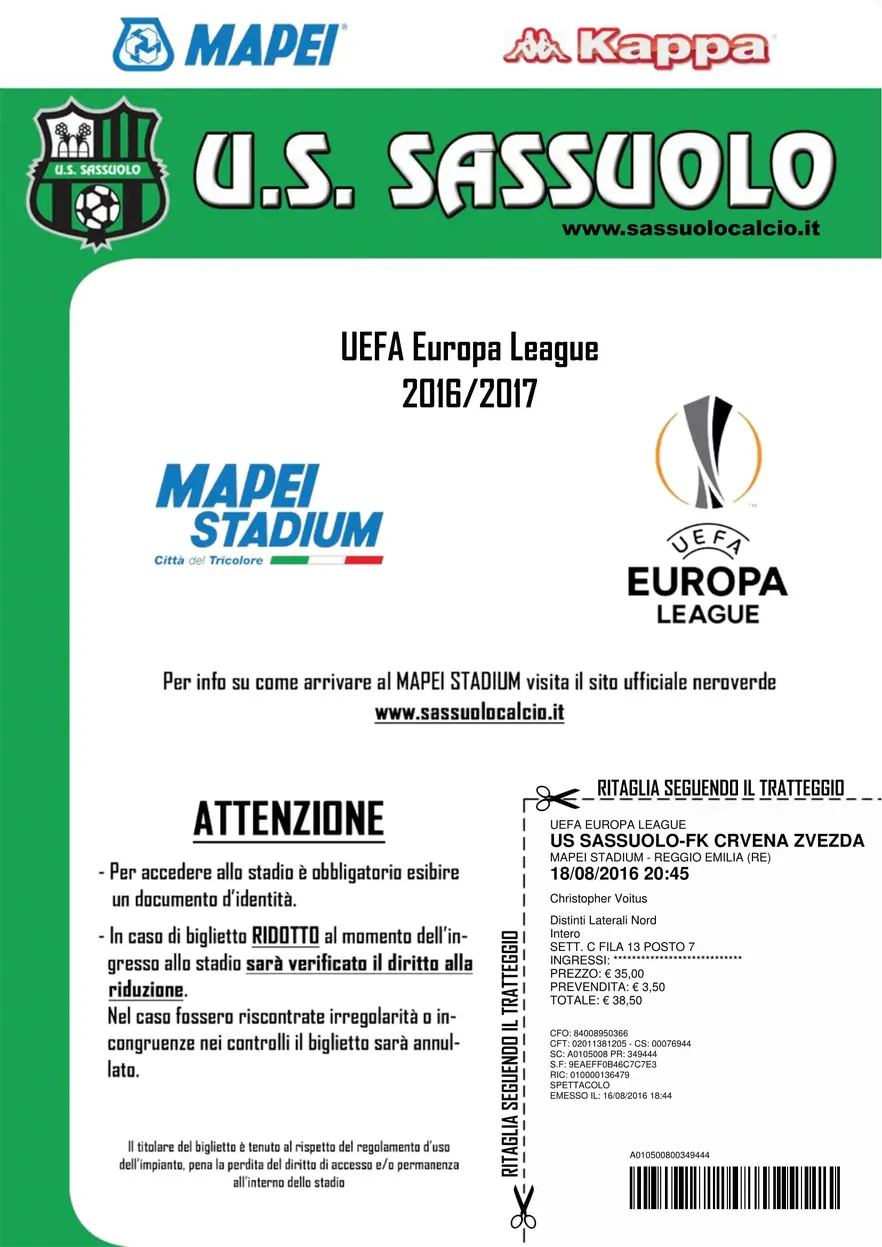 Das Mapei Stadion bietet Platz für gut 29.000 Zuschauer, aus Sicherheitsgründen ist es aktuell für 21.000 Zuschauer zugelassen. In der zweiten Runde der Europa League Qualifikation gegen den FC Luzern kamen 14.500 Zuschauer ins Mapei Stadium. Da der heutige Gegner Roter Stern Belgrad nach meinem Ermessen der attraktivere Gegner ist, hatte ich mit einem möglicherweise ausverkauften Stadion gerechnet. Aber weit gefehlt, es kamen heute nur 6.800 Zuschauer. Vielleicht war der saftige Preis von 35 Euro plus diverser Gebühren (und somit insgesamt über 40 Euro) dafür verantwortlich, dass einige das Spiel lieber am Fernsehen verfolgt haben - obwohl ich nicht weiß, was die Tickets gegen Luzern gekostet hatten. Oder es lag dann noch an der zentralen Urlaubszeit Mitte August.